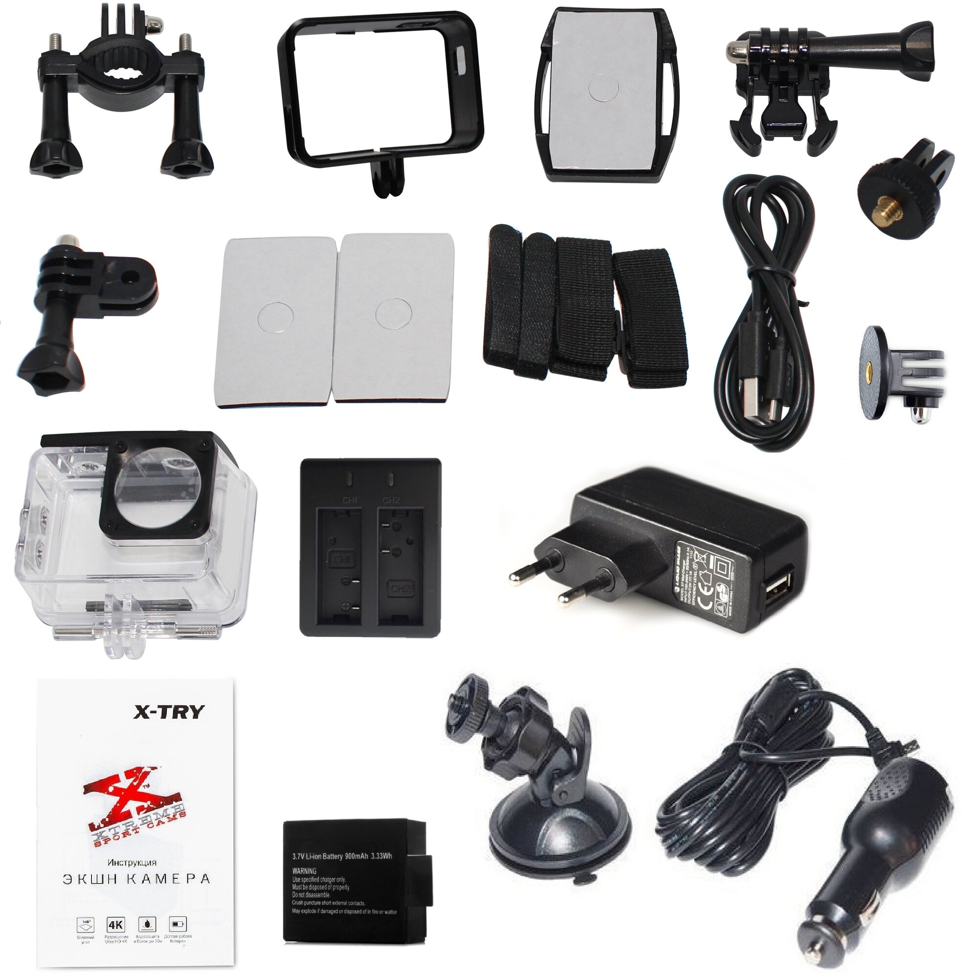 | Комплектация | гермобокс, рамка для монопода, универсальное крепление, универсальный винт с креплением, универсальный переходник, прямоугольная платформа с 3М-скотчем, прямоугольный двухсторонний 3М-скотч х 2 шт, универсальные ремешки х 4 шт., автомобильное зарядное устройство, крепление-переходник с резьбой, крепление на стекло автомобиля (присоска), сетевое зарядое устройство 220В, заряное устройство на 2 АКБ и дополнительная АКБ емкостью 900 mAh, пульт ДУ |