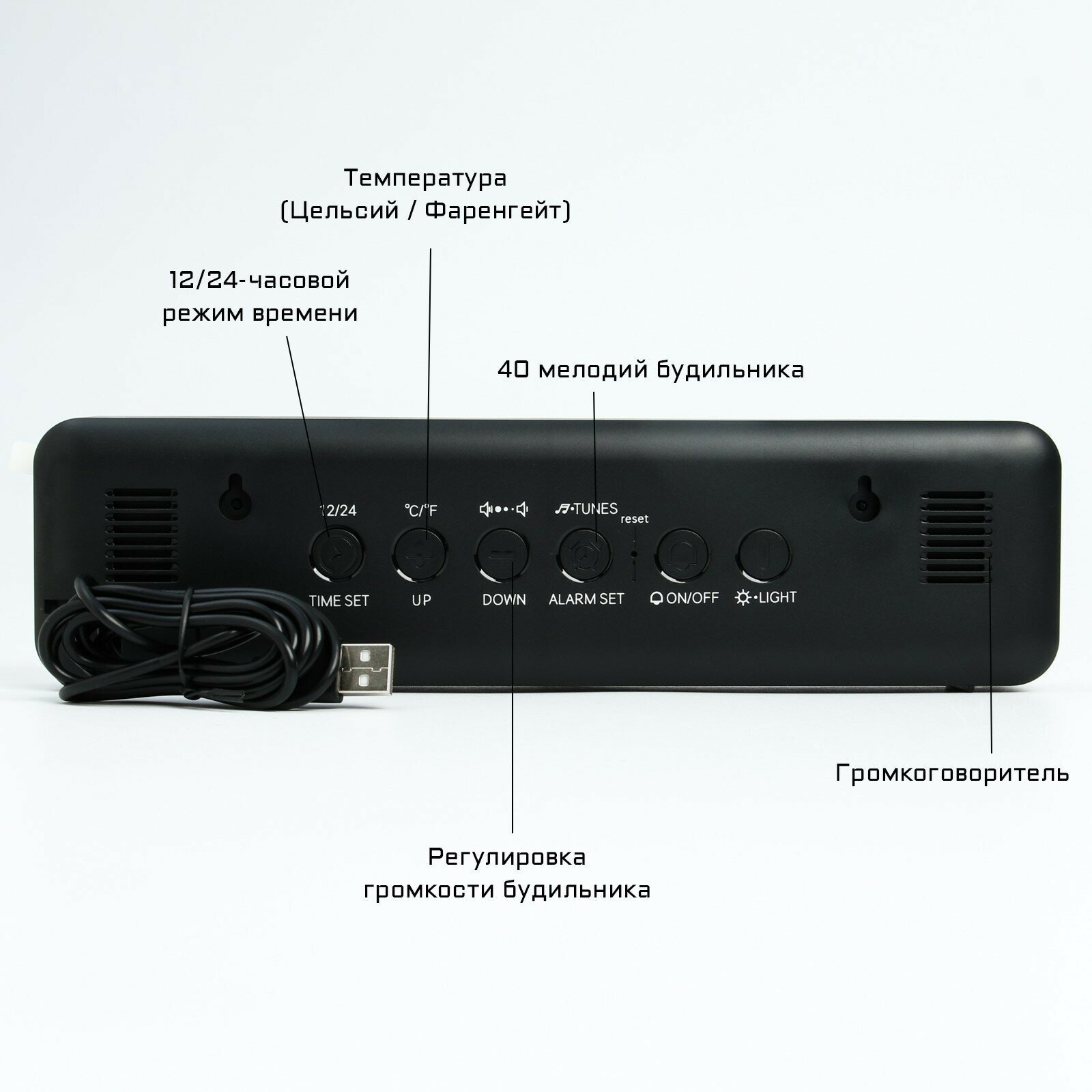 Часы настольные электронные с проекцией: будильник, термометр, календарь, 19.6 х 6.5 см