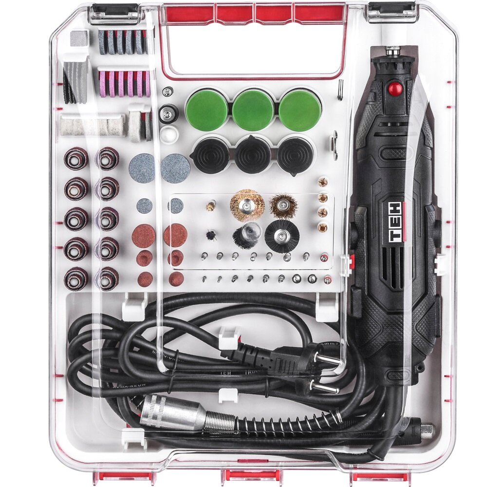 | Комплектация | Гравер; Гибкий вал; Ключ гаечный; Комплект аксессуаров – 218 шт.; Руководство по эксплуатации; Кейс. |