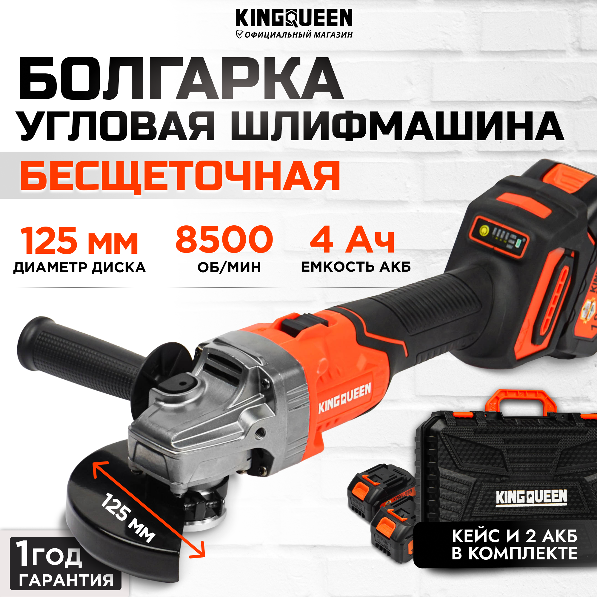 Угловая шлифовальная машина аккумуляторная KINGQUEEN PROFESSIONAL, 8500 об/мин болгарка бесщеточная УШМ 125 мм, 4.0А*Ч