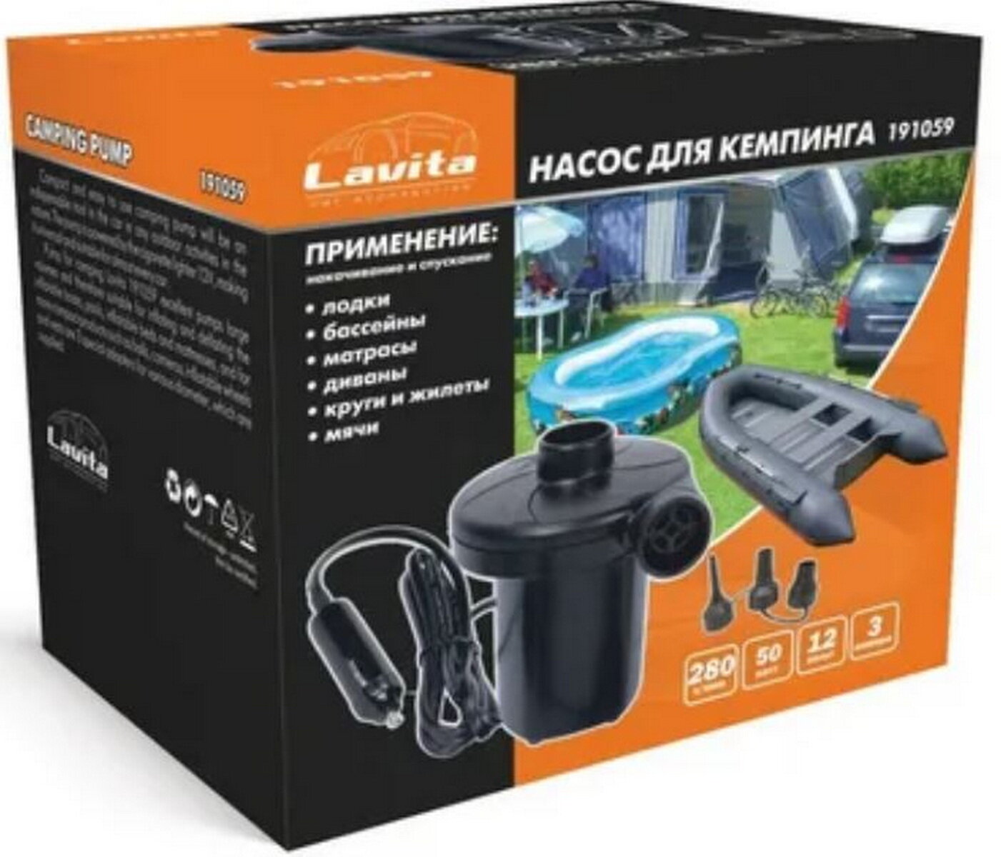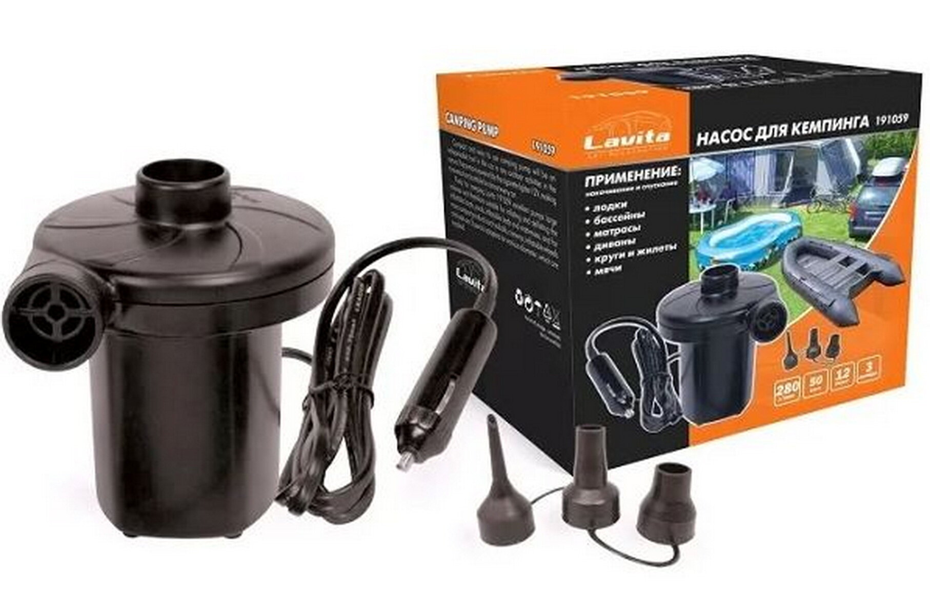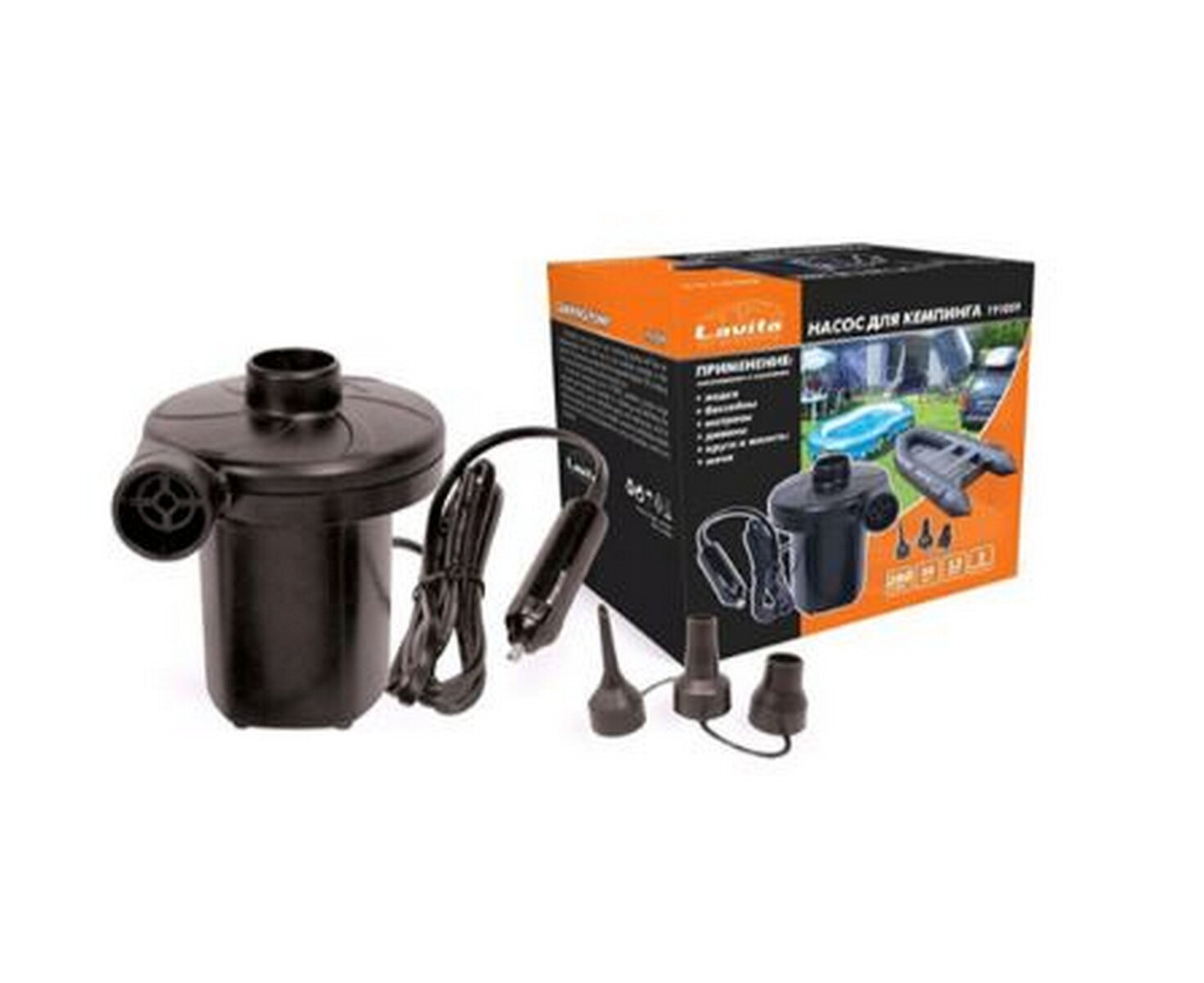 Компрессор Lavita LA-191059 12V насос для резиновых лодок и матрасов, 3 насадки