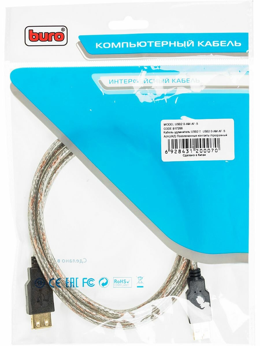 Удлинитель Buro USB - USB (USB2.0-AM-AF-S), прозрачный