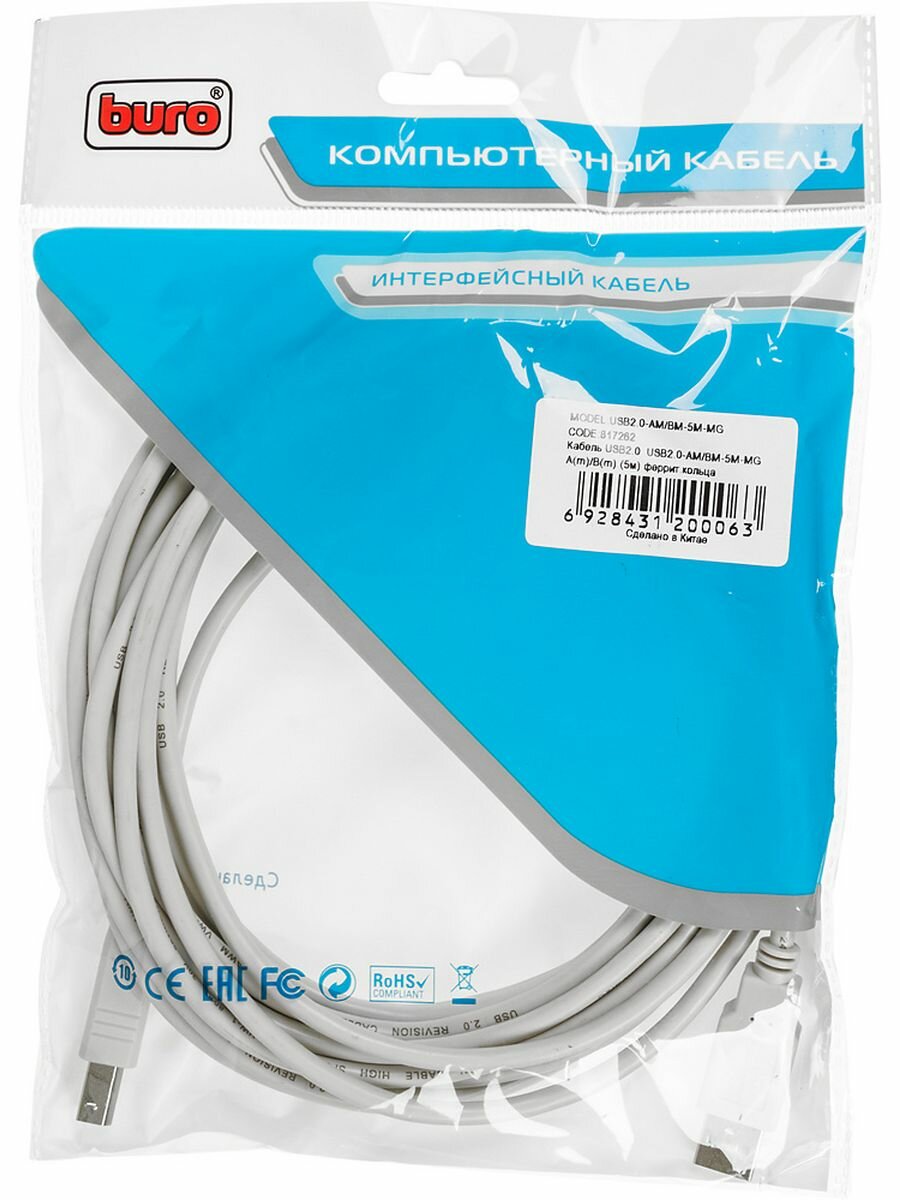 Кабель Buro 817262 USB2.0-AM/BM-5M-MG USB 2.0 A-B 5 метров, ферритовые кольца, белый