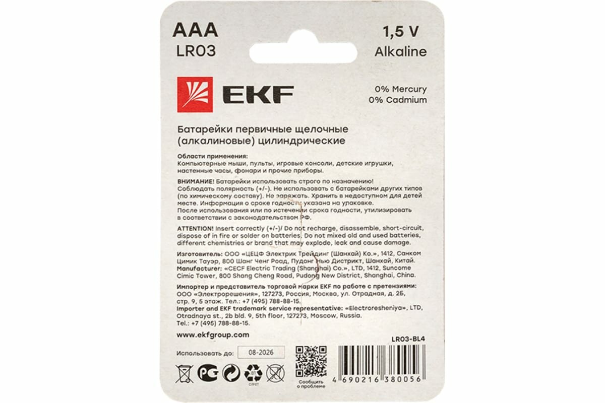 Элемент питания алкалиновый EKF, тип ААА, шринк, LR03, 1,5 В, 4 шт