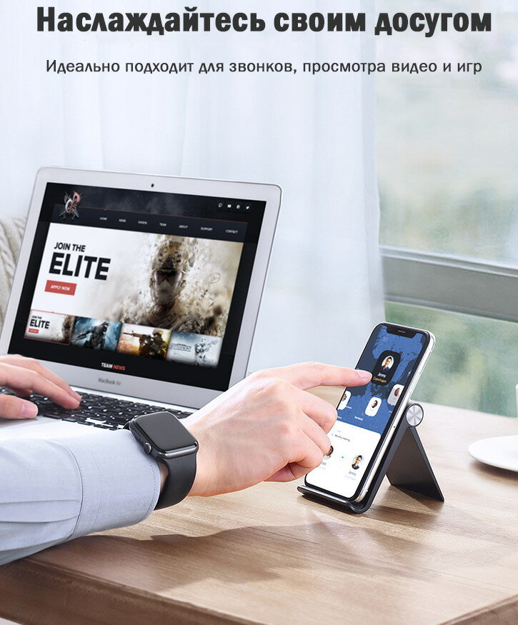 | Плюсы: | Регулируемый наклон, ровный, точка соприкосновения низа телефона и подставки отделана мягким материалом. |