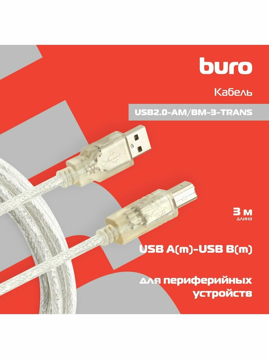 Купить Кабель USB2.0 Buro USB2.0-AM/BM-3-TRANS, USB A(m) - USB B(m), 3м, прозрачный