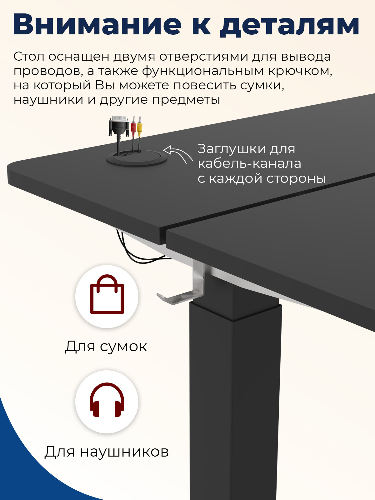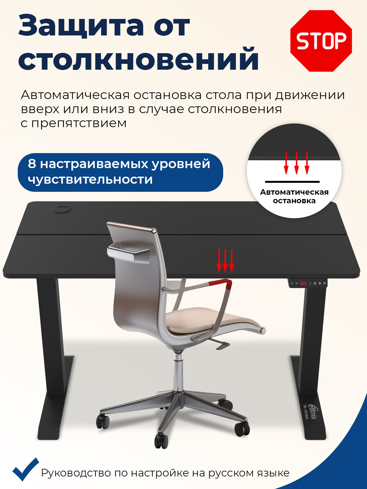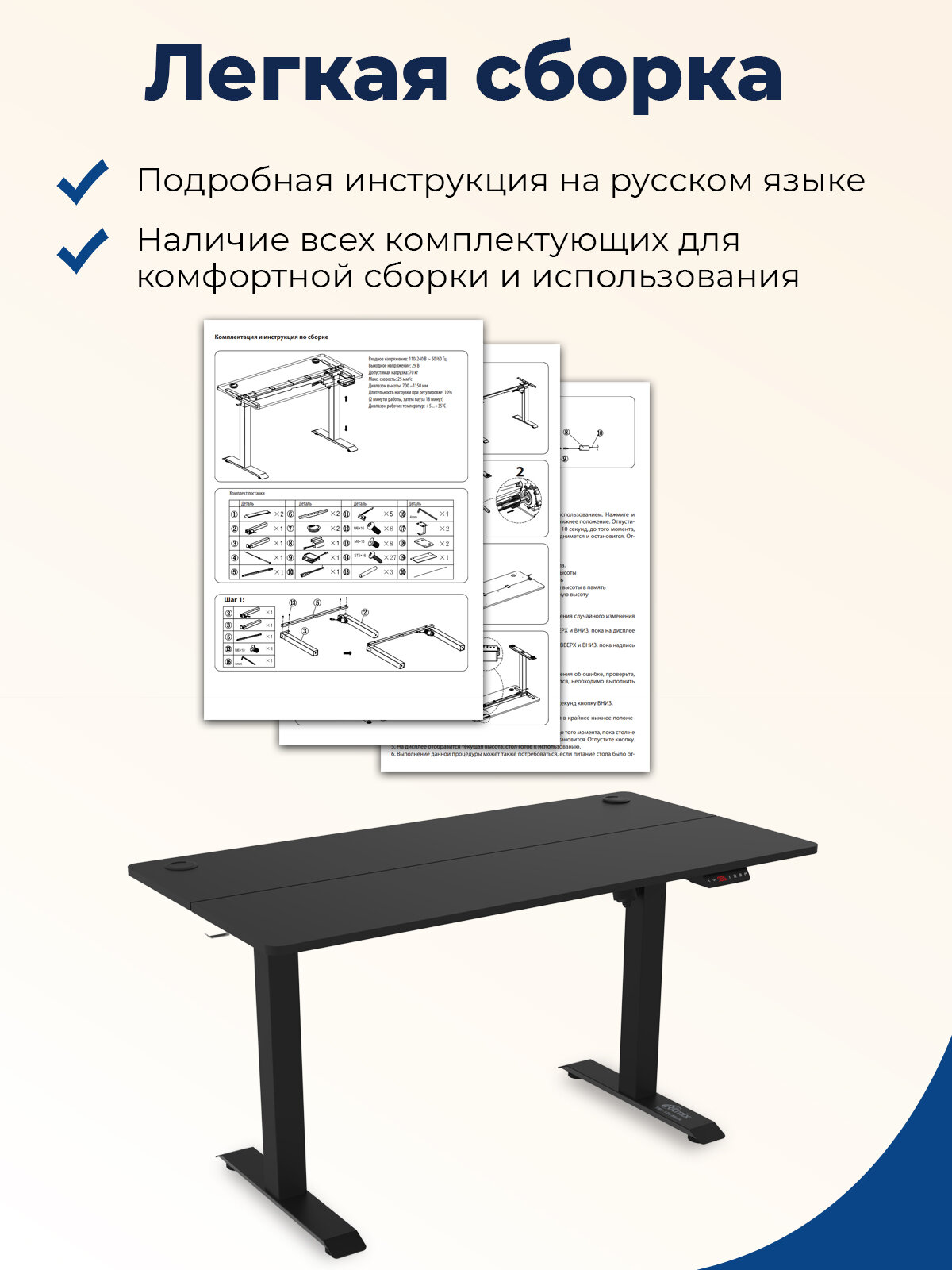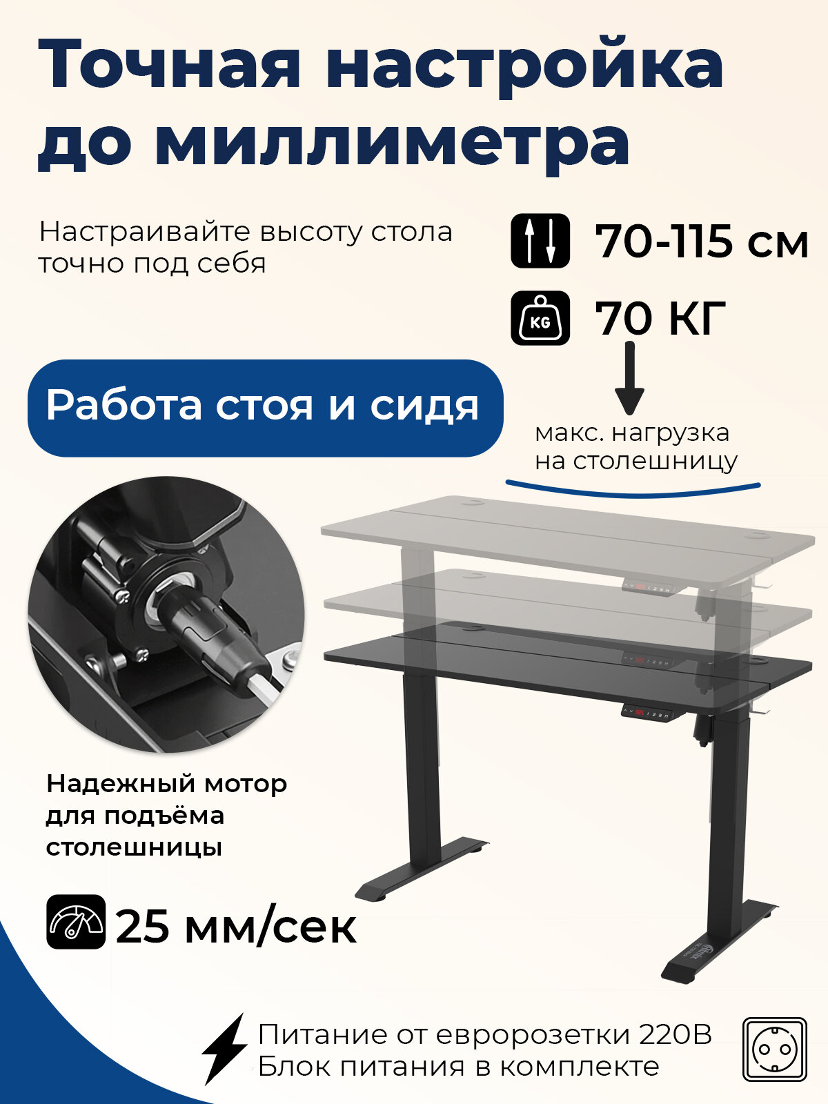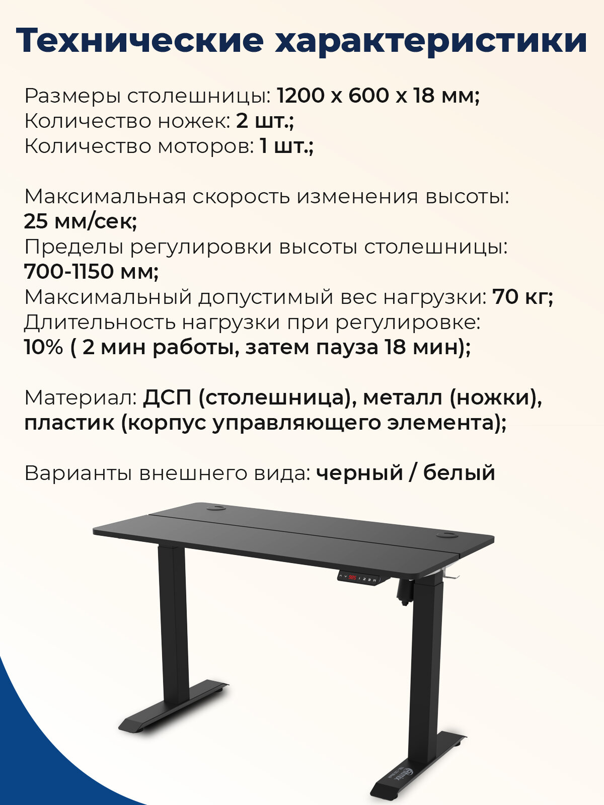 | Дополнительная информация | С изменяемой высотой столешницы посредством электромотора Возможность работать стоя и сидя Пределы регулировки высоты столешницы - 700...1150 мм |