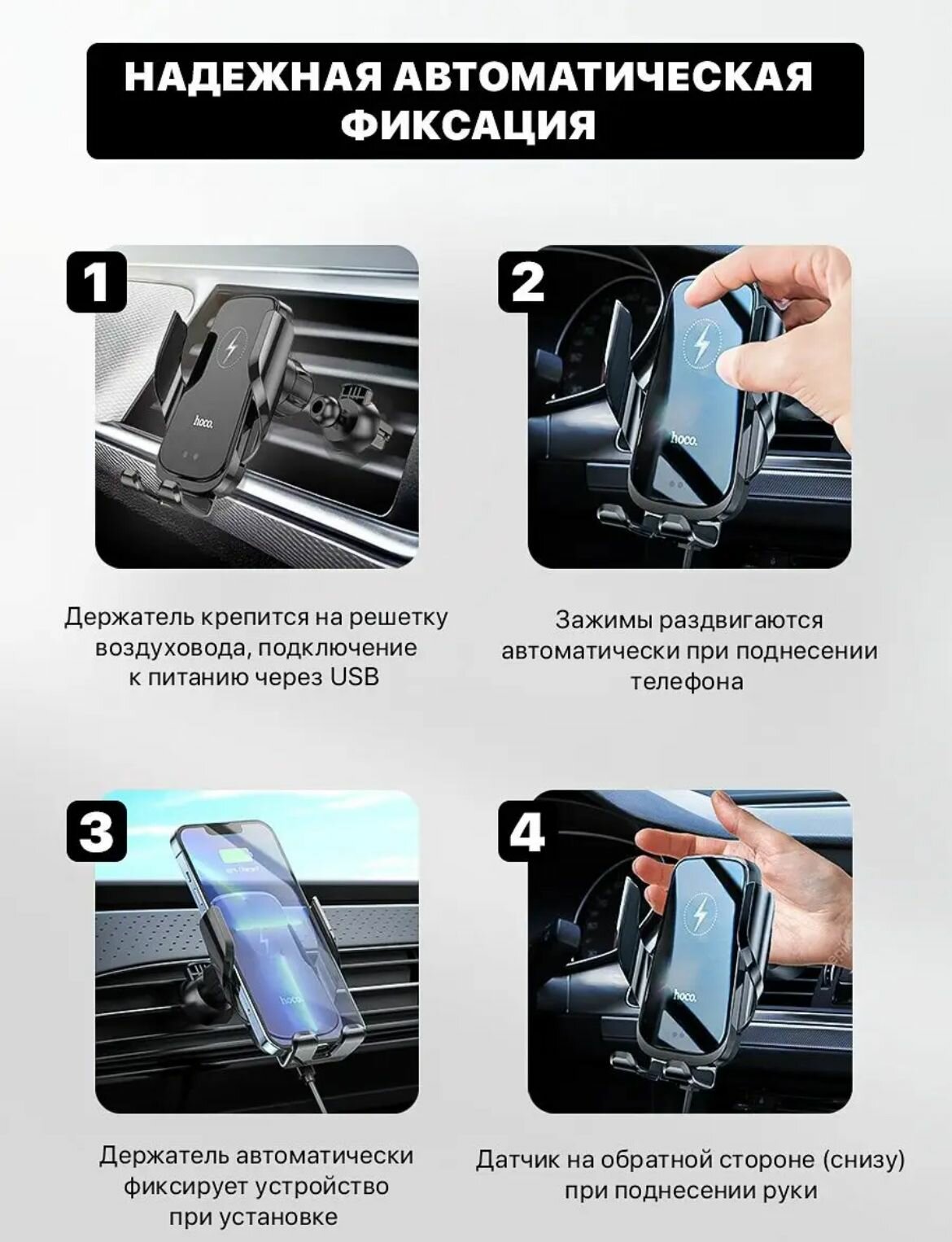 Держатель для телефона автомобильный автоматический в машину на воздуховод Hoco CA202 с беспроводной зарядкой 15W для iPhone, Android, цвет черный