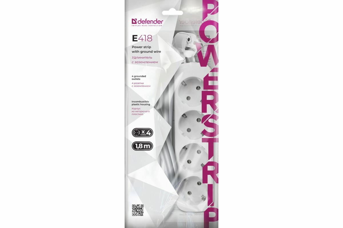 Удлинитель Defender E418 (99225), 4 розетки, 1.8 м, белый