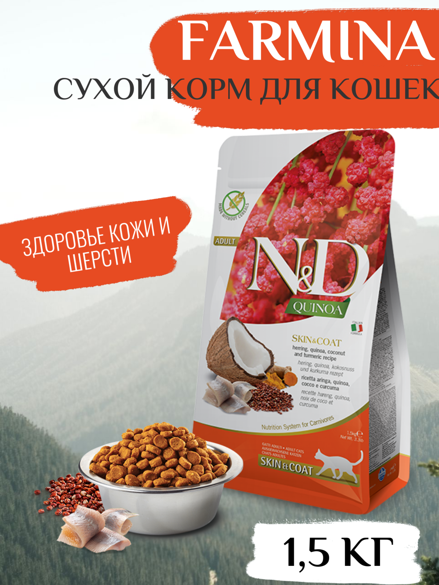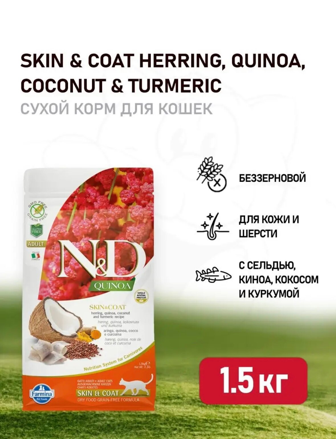 Сухой корм для взрослых кошек Farmina N&D Quinoa, беззерновой, для здоровья кожи и блеска шерсти, с сельдью, с киноа, с кокосом, с куркумой 1.5 кг