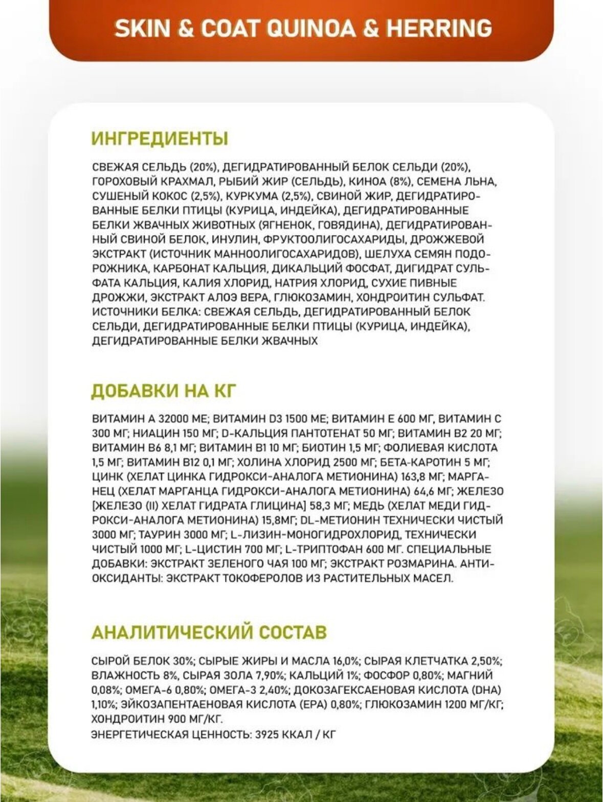 | Особые потребности | беззерновой / гипоаллергенный / для здоровья кожи и блеска шерсти / Для длинношерстных породУход за кожей и шерстью / Защита суставов / С чувствительным пищеварением / Склонные к аллергии / Уход за кожей и шерстью |