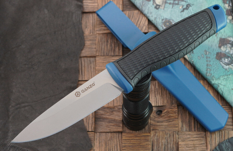Нож фиксированный с ножнами туристический тактический походный для выживания и охоты GANZO G806 черный с синим