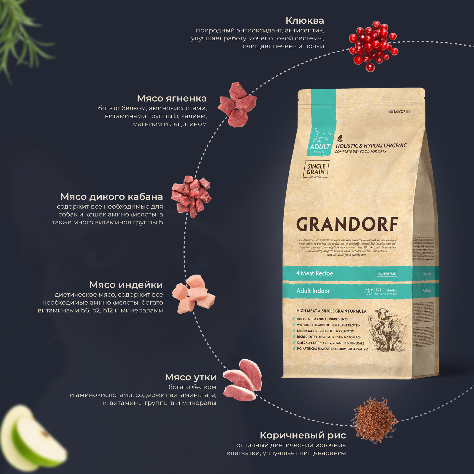 GRANDORF SINGLE GRAIN CAT ADULT INDOOR 4 MEAT RECIPE низкозерновой для взрослых кошек живущих дома 4 вида мяса с индейкой, уткой, кабаном и ягненком (2 + 2 кг)