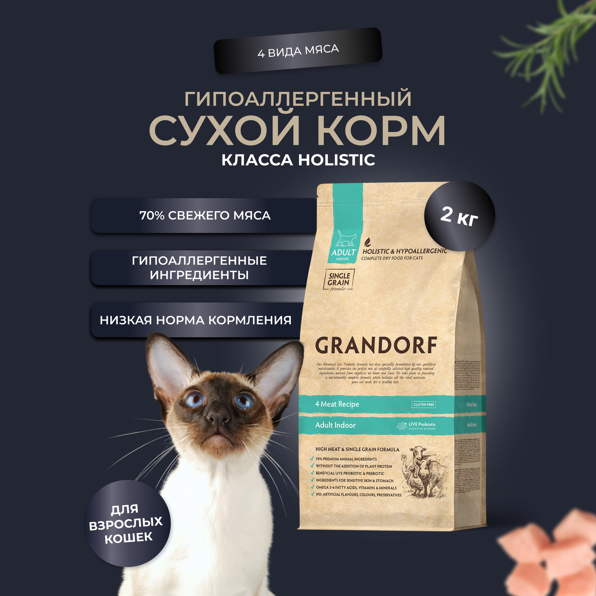 GRANDORF 4 Meat Adult Indoor, 2 кг (сухой корм для кошек 4 мяса: индейка, утка, кабан, ягненок)