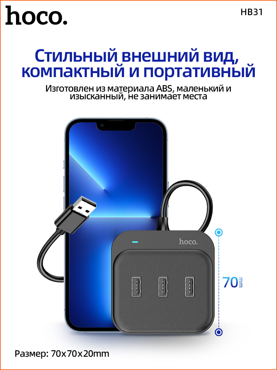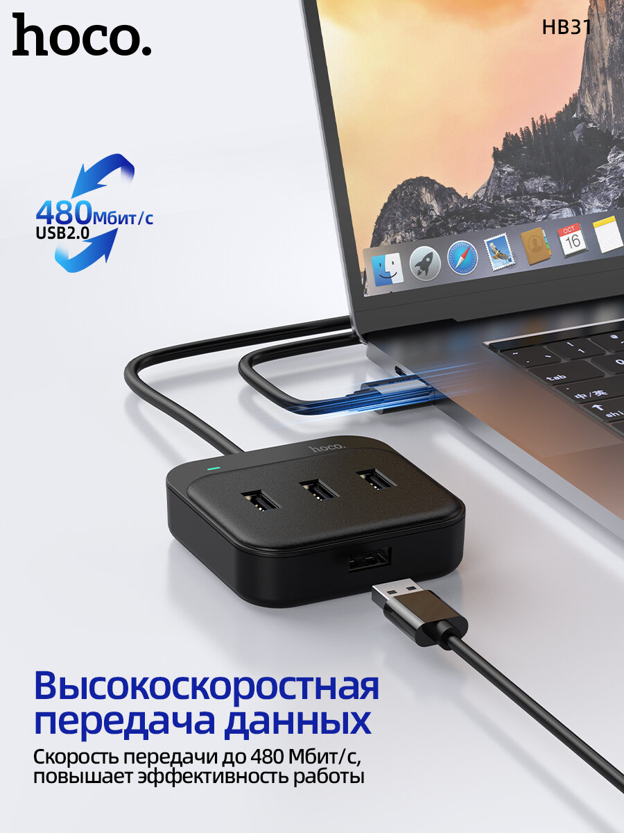 USB-концентратор HOCO HB31, Easy, 4 гнезда, кабель 1.2м, цвет: чёрный