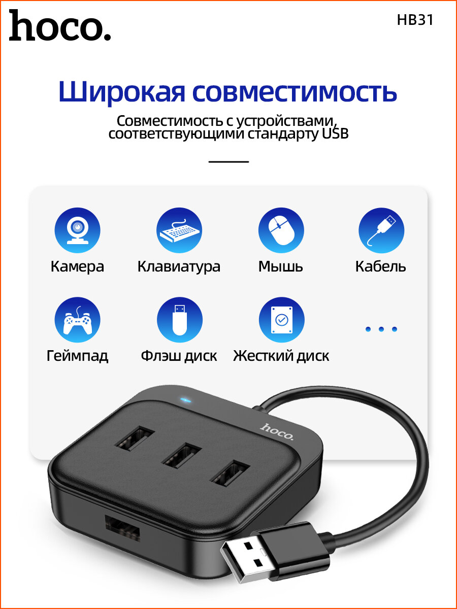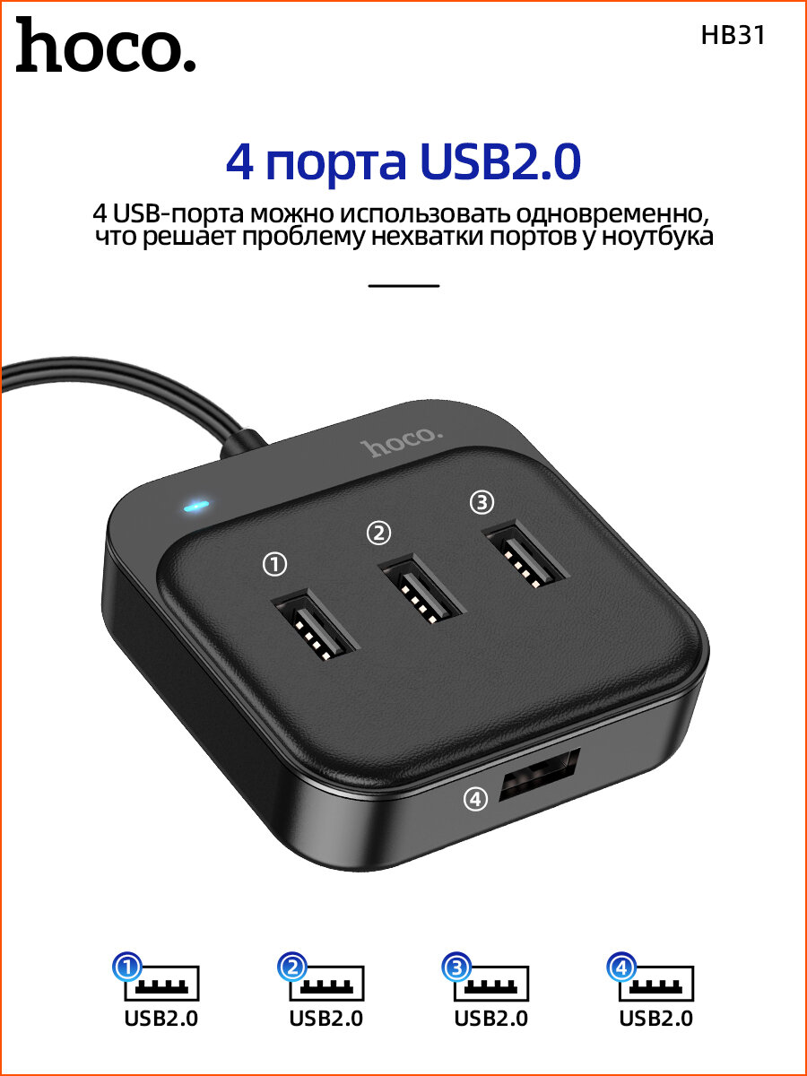 HUB адаптер HOCO HB31 Easy 4-in-1, Type-C to USB 2.0*4, Кабель 0.2m, Черный интересное: