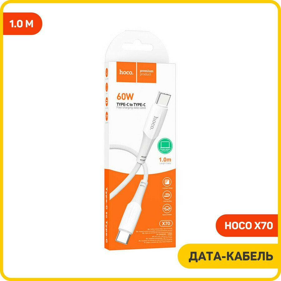 Купить Кабель Hoco X70, Type-C - Type-C, 60 Вт (зарядка ноутбука), 3 А, 1 м, нейлон оплетка, белый
