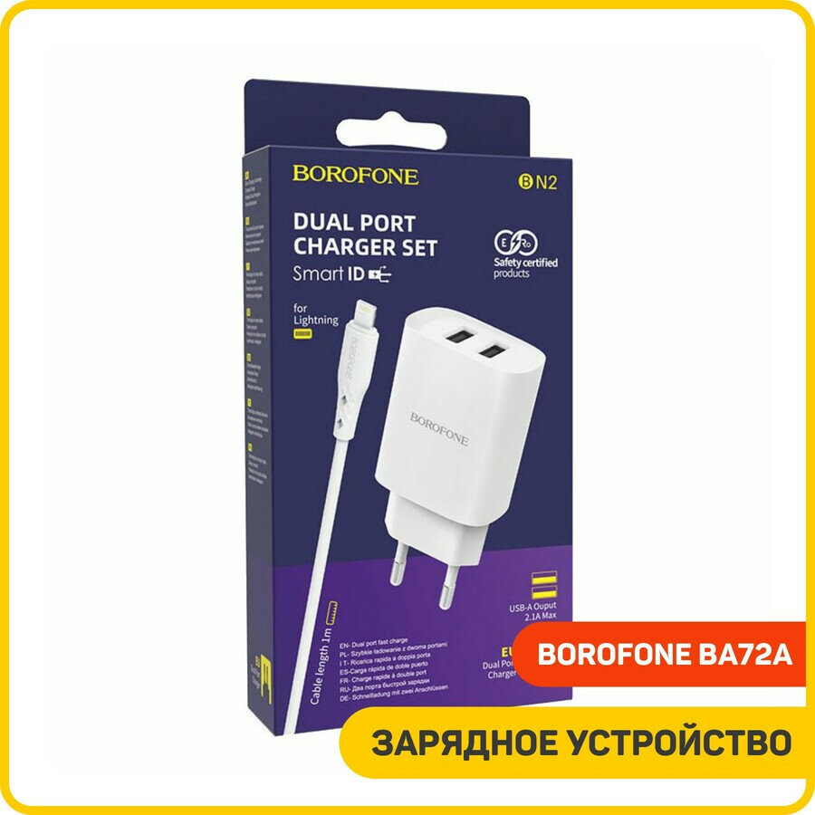 Сетевое зарядное устройство (СЗУ) Borofone BA72A (USB) + кабель Lightning, 2.1 А, белый