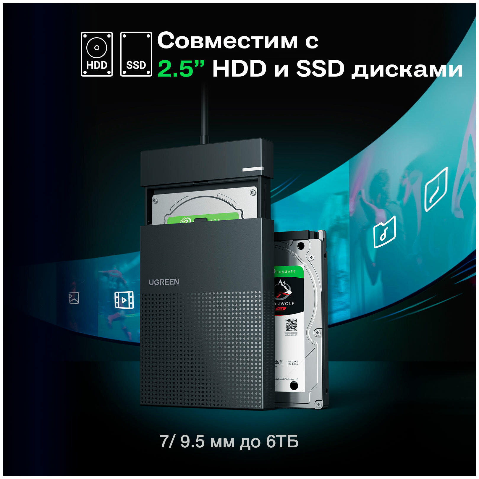 Корпус для жесткого диска Ugreen CM471 2.5'' SATA I II III, HDD, SSD, до 6ТБ, с кабелем 5G, цвет черный (30719)