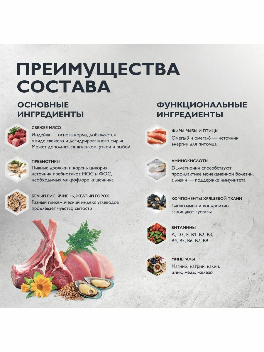 | Состав | дегидрированное мясо курицы 37 %, маис цельнозерновой, маисовый протеин, рис, жир куриный (источник Омега-6 жирных кислот), свекольная пульпа, гидролизованная и дегидратированная печень 2,5 %, яблоки, дрожжи (источник маннанолигосахаридов), витаминно-минеральный комплекс, рыбий жир (источник Омега-3 жирных кислот), таурин, топинамбур (источник фруктоолигосахаридов), клюква, антиокислитель, экстракт юкки Шидигера |