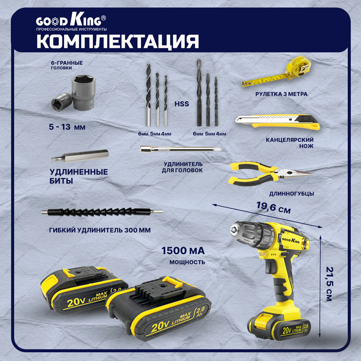 Дрель шуруповёрт GOODKING, аккумуляторная, с набором инструментов, в кейсе