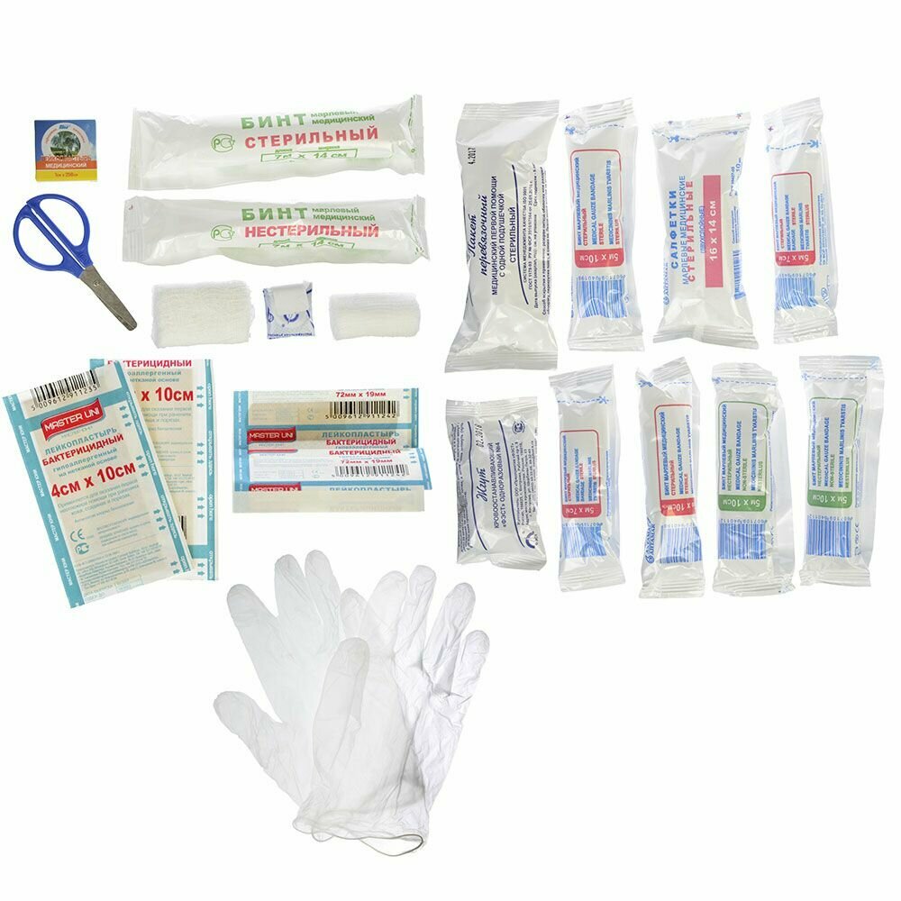 | Состав | Маска медицинская нестерильная одноразовая - 2 шт. Перчатки медицинские нестерильные, размером не менее М - 2 пары. Устройство для проведения искусственного дыхания «Рот-Устройство-Рот» * - 1 шт. Жгут кровоостанавливающий для остановки артериального кровотечения * - 1 шт. Бинт марлевый медицинский размером не менее 5 м х 10 см - 4 шт. Бинт марлевый медицинский размером не менее 7 м х 14 см - 3 шт. Салфетки марлевые медицинские стерильные размером не менее 16 х 14 см № 10 - 2 уп. Лейкопластырь фиксирующий рулонный размером не менее 2 см х 500 см - 1 шт. Ножницы - 1 шт. Инструкция по оказанию первой помощи с применением аптечки для оказания первой помощи пострадавшим в дорожно-транспортных происшествиях (автомобильной) - 1 шт. Футляр - 1 шт. ; * - изделие одноразовое |