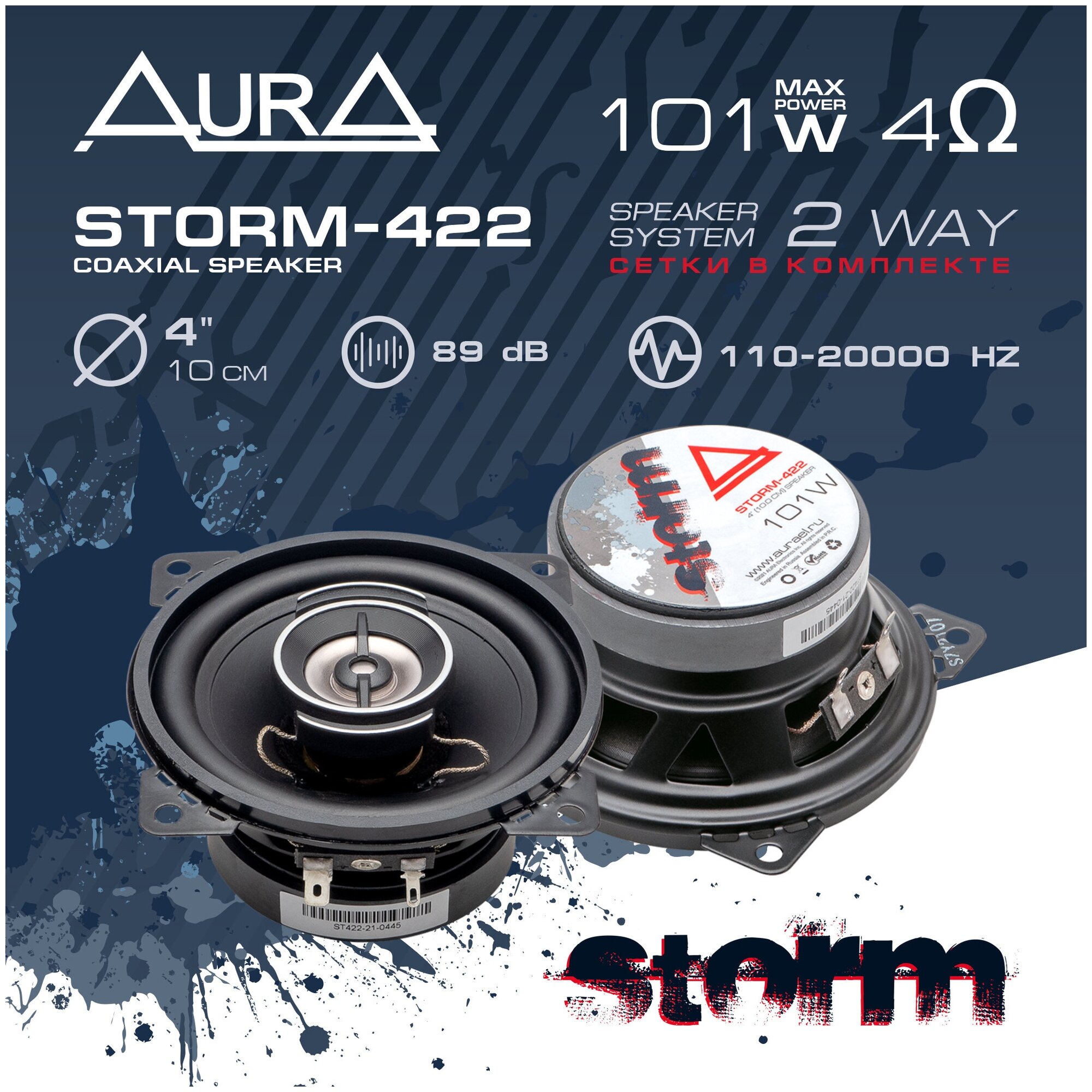Динамики двухполосные коаксиальные 101 Вт, 10 см - Aura STORM-422 (2 шт)
