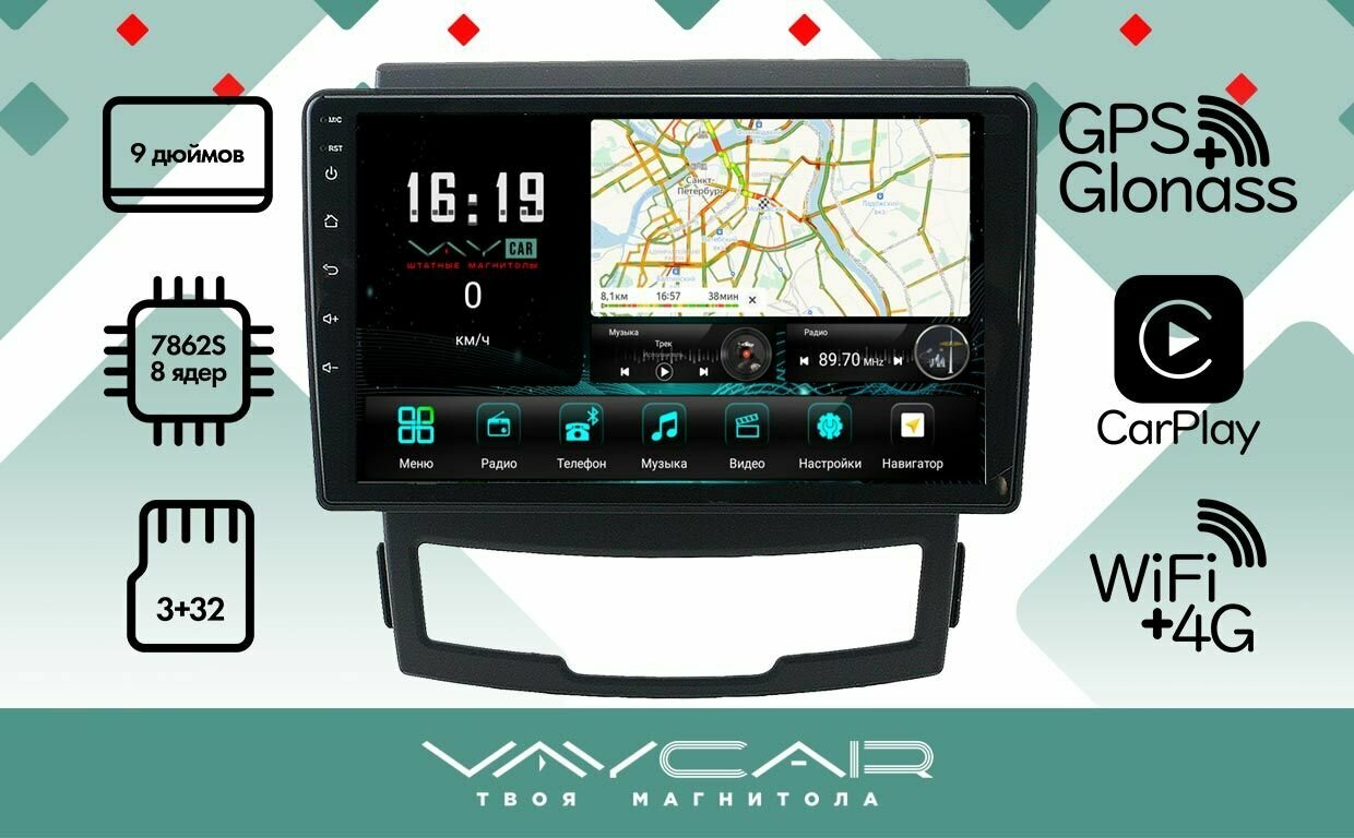 Магнитола Vaycar 09VO4 для SSANG YONG Actyon 2011-2013 (Андроид, 4+64, 8 ядер, WiFi, BT, 4G, GPS, QLED 9")