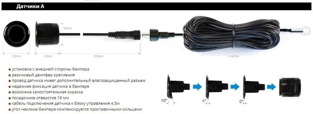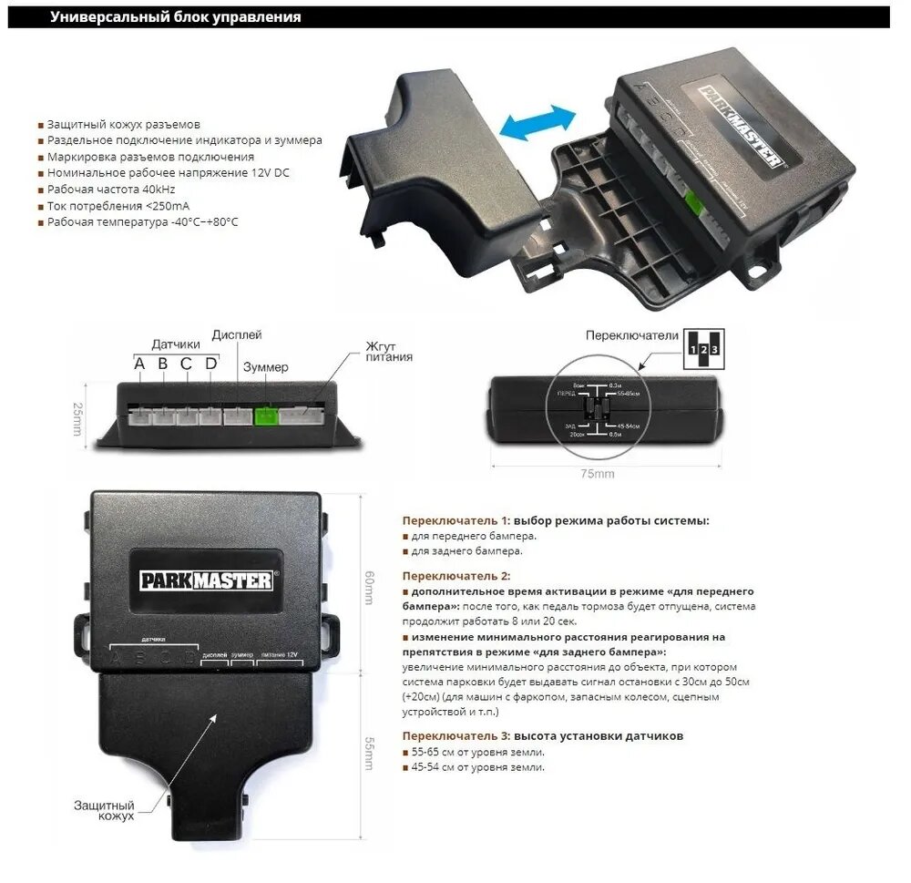 | Особенности | встроенный динамик / запоминание выносных элементов автомобиля / изменение минимального расстояния реагирования на препятствия / самодиагностика датчиков |