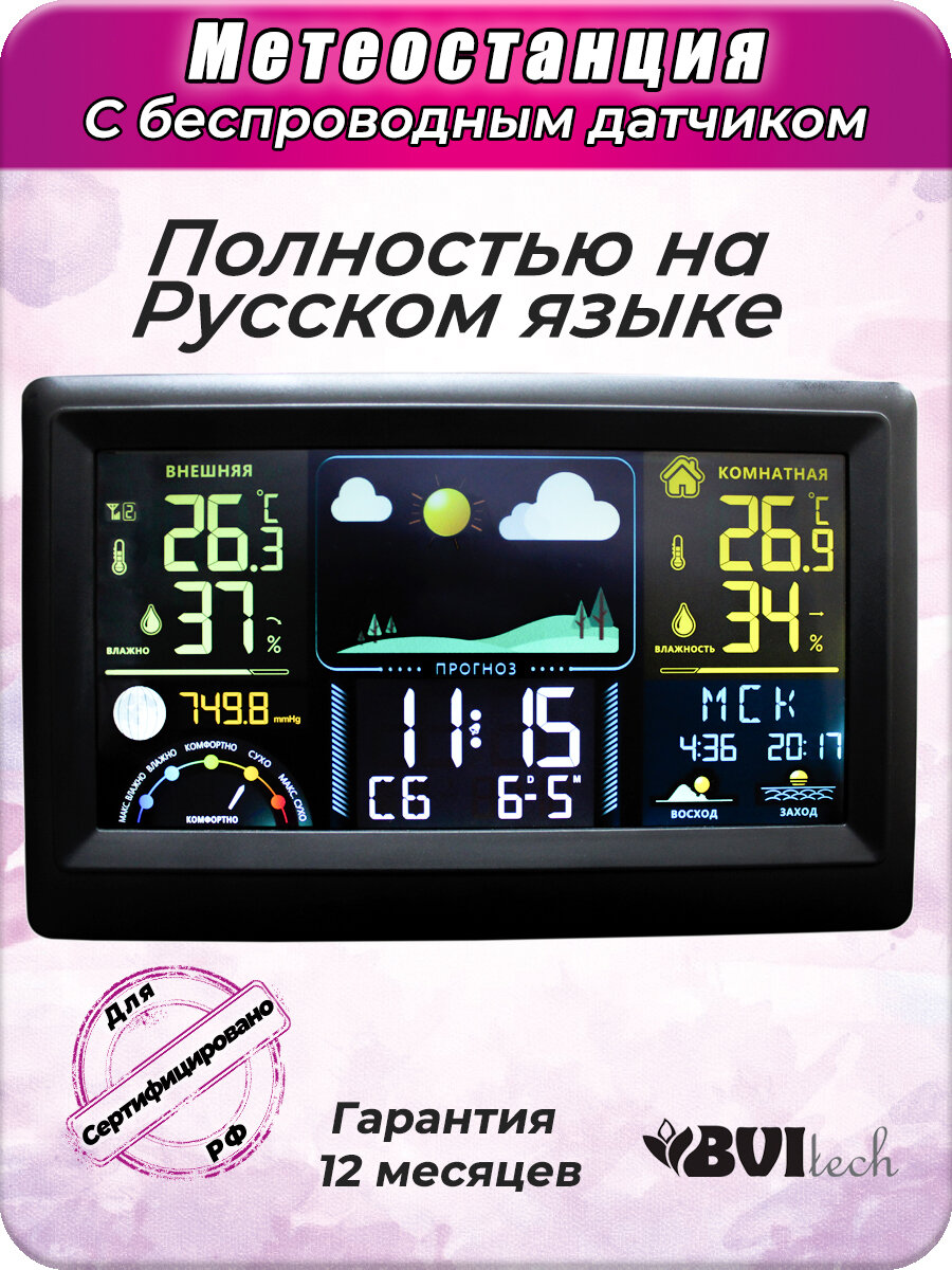 Метеостанция "BV-675" с беспроводным датчиком полностью на русском языке.