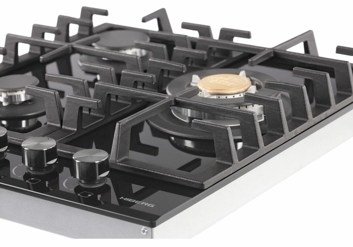 Газовая варочная поверхность HIBERG VM 4535 B, таймер отключения газа всех конфорок, газ-контроль, электроподжиг, чугунные решетки.