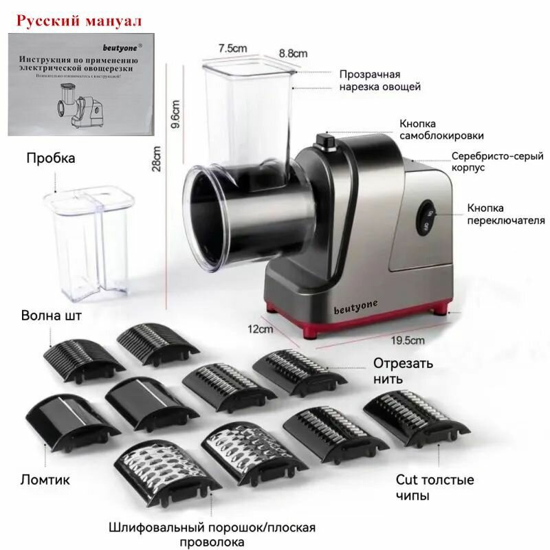 | Подробная комплектация | Электрическая овощерезка*1 С 5 различными режущими барабанами (стандартные лезвия) Русский мануал |