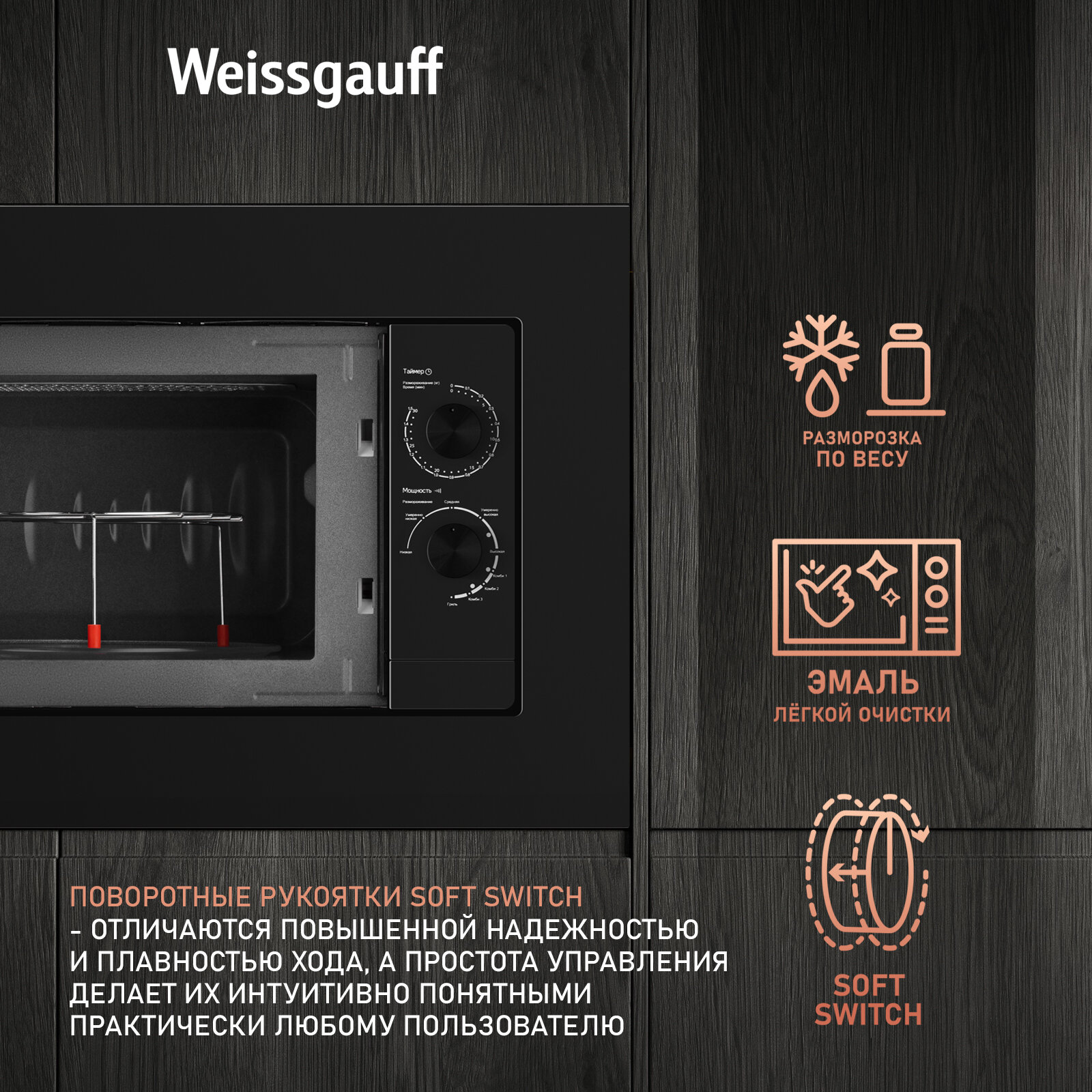 Встраиваемая микроволновая печь Weissgauff HMT-2016 Grill 3 года гарантии, объем 20 литров, гриль, разморозка по весу