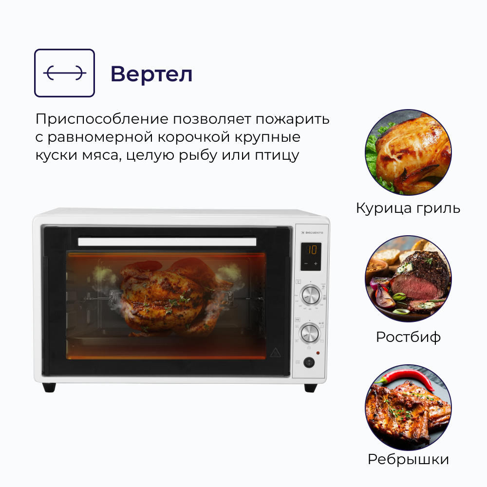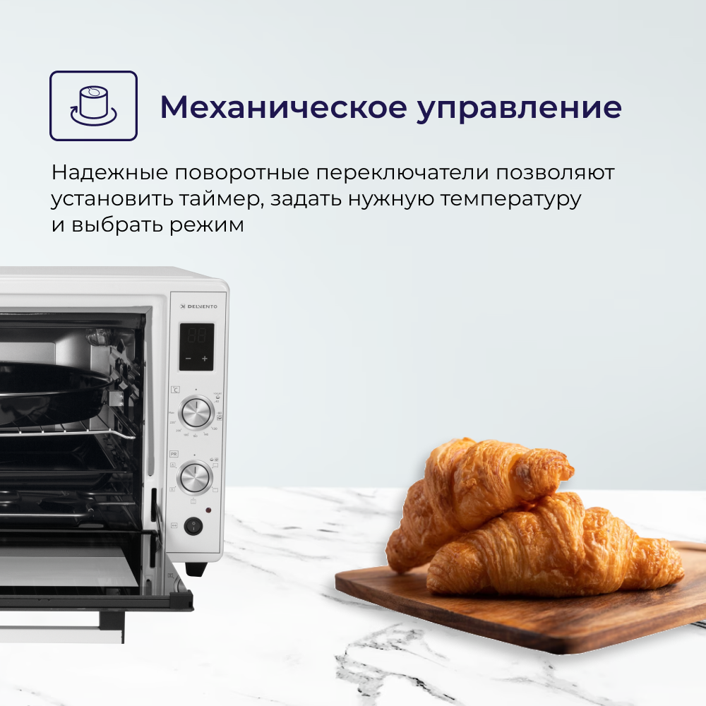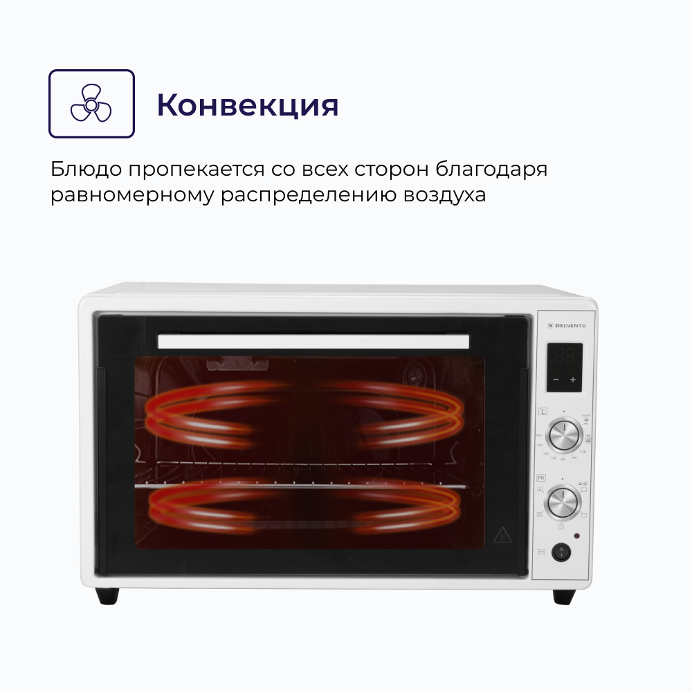 Мини печь электрическая DELVENTO D7010 / дисплей / 70 литров / 5 режимов, конвекция / тостер / таймер 90 минут с оповещением / 2 противня / вертел / хромированная решетка / 240 градусов / автоотключение / цвет белый интересное: