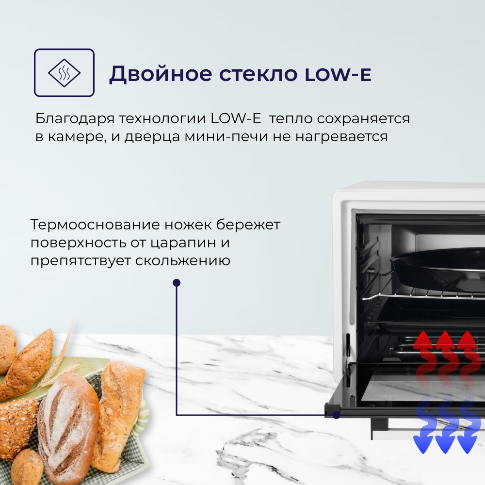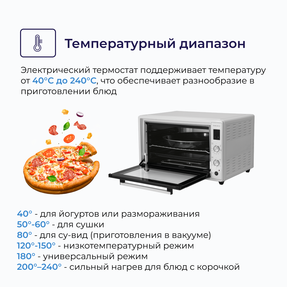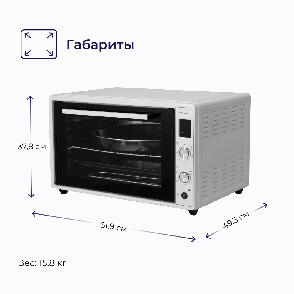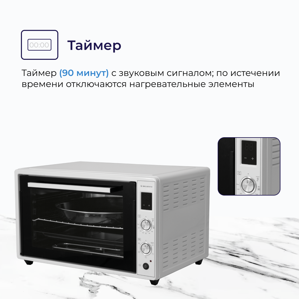 Мини печь электрическая DELVENTO D7010 / дисплей / 70 литров / 5 режимов, конвекция / тостер / таймер 90 минут с оповещением / 2 противня / вертел / хромированная решетка / 240 градусов / автоотключение / цвет белый интересное: