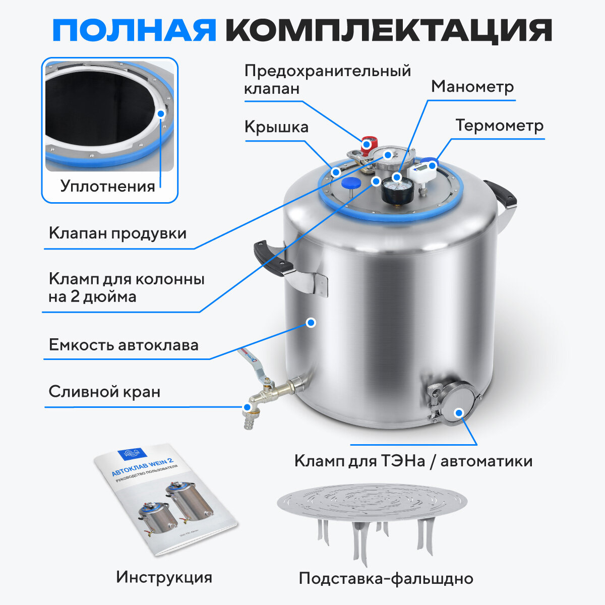 | Подробная комплектация | Емкость 1 шт; Крышка 1 шт; Фальшдно 2 шт; Клапан продувки 1 шт; Заглушка под кламп 2 дюйма 1 шт; Уплотнение байонета 1 шт; Резинка декоративная 1 шт; Колпачок ручки 2 шт; Силиконовая втулка 1 шт; Гайка М8 1 шт; Клапан предохранительный 1,5 бар 1 шт; Кран с носиком 1 шт; Манометр 1 шт; Термометр 1 шт; Хомут для клампа с уплотнением 2 дюйма 2 шт; Инструкция 1 шт. |