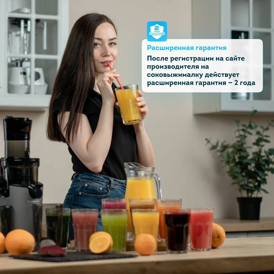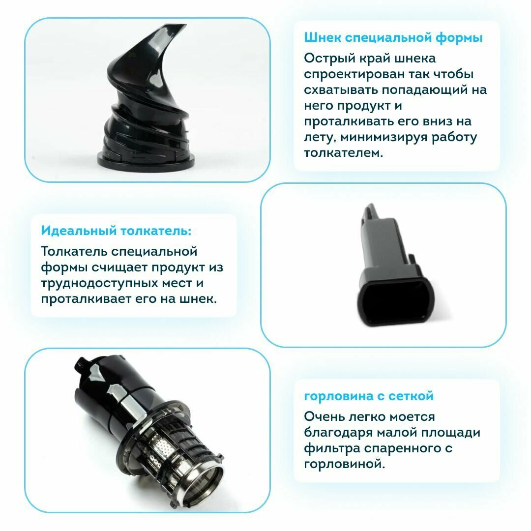 | Подробная комплектация | Шнековая соковыжималка, толкатель, емкость для сока, емкость для жмыха, щетка для чистки, инструкция на русском языке |