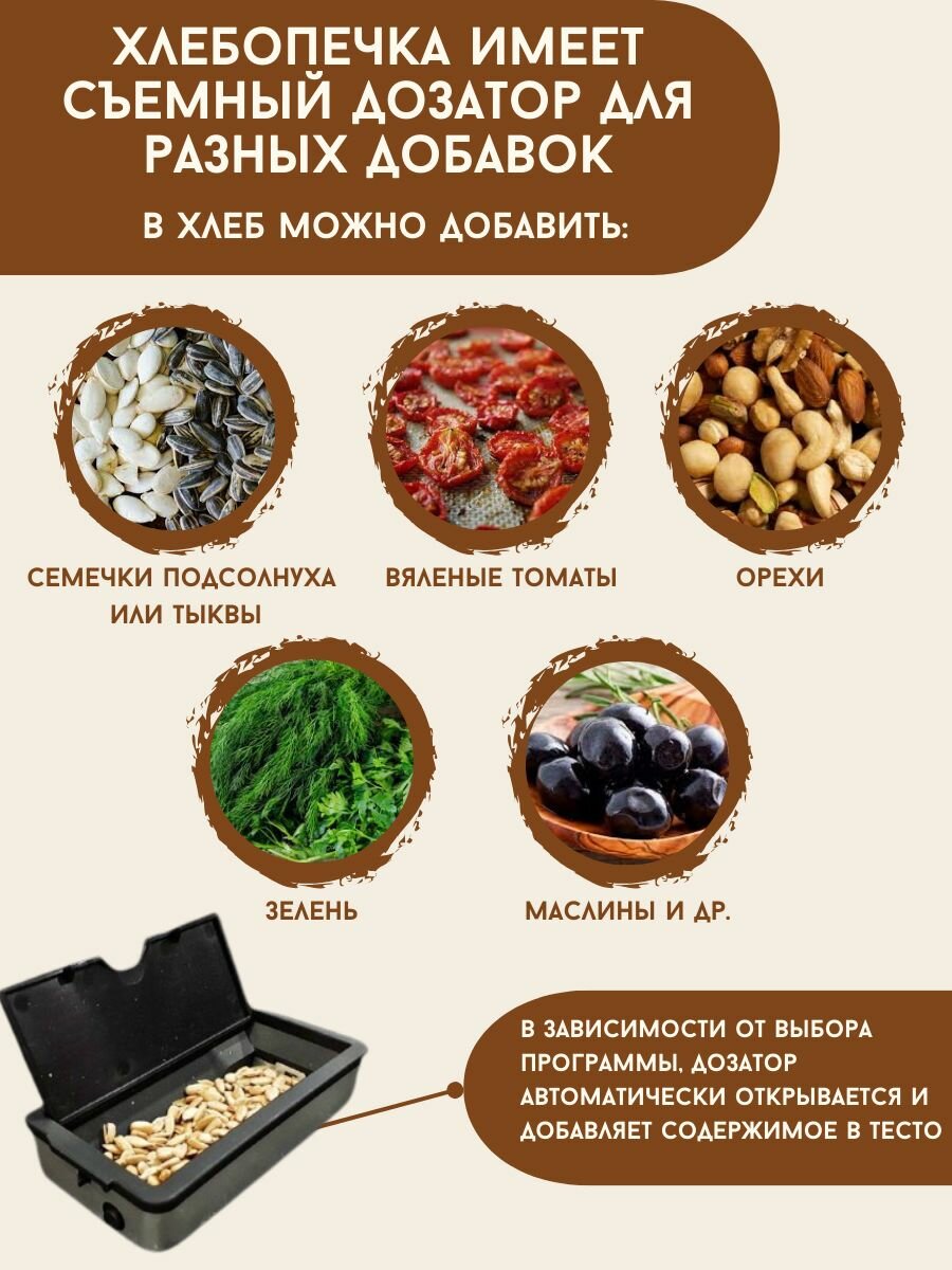 | Особенности | выбор цвета корочки / диспенсер / поддержание температуры / регулировка веса выпечки / таймер / ускоренная выпечка |