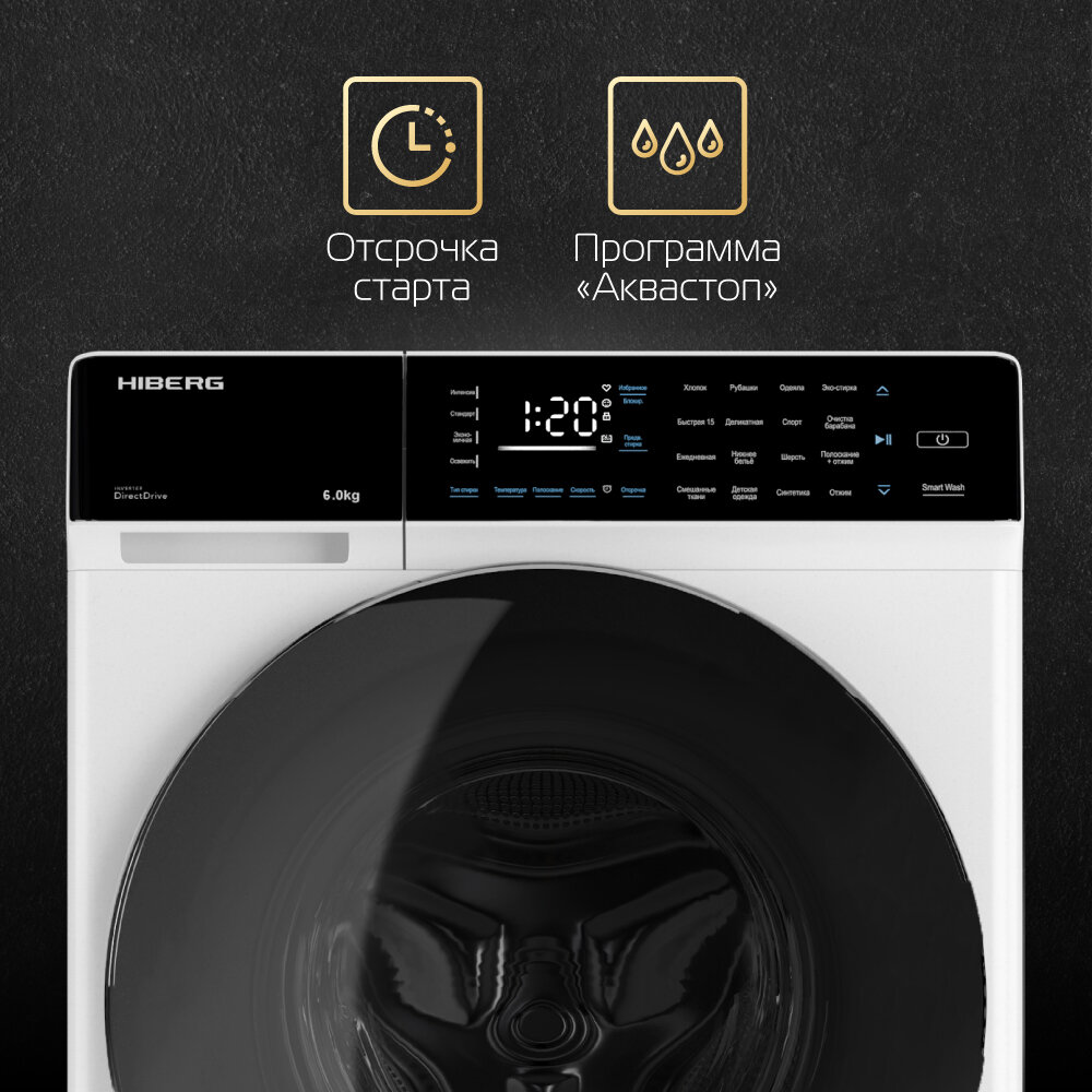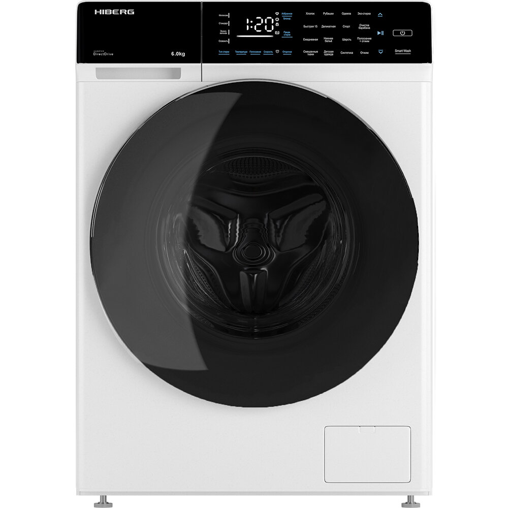 Стиральная машина HIBERG i-DDQ9 - 612 Sd Inverter, Прямой привод DD, Smart - стирка в одно касание, Подсветка барабана, 6 кг, 1200 оборотов