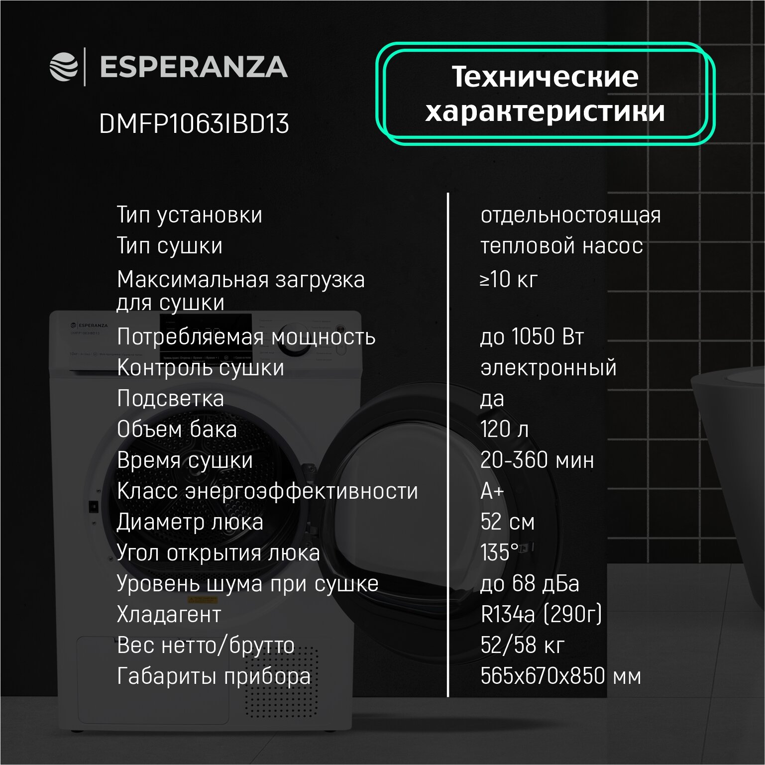 Сушильная машина ESPERANZA DMFP1063IBD13, тепловой насос, 120 л, датчик сушки, инверторный двигатель