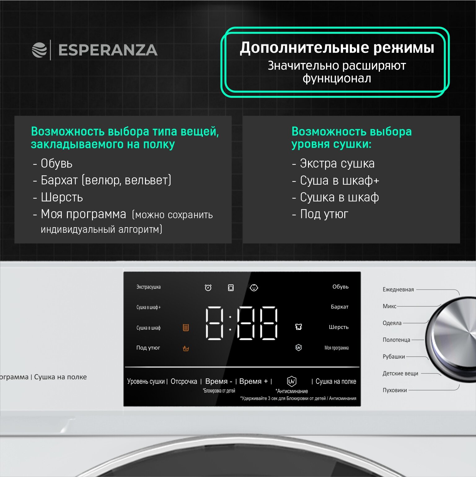 | Режимы / функции | бережная сушка / верхняя одежда / детская одежда / джинсы / лёгкая глажка / нижнее бельё / полотенца / постельное бельё / проветривание / синтетика / смесовые ткани / сорочки (рубашки) / спортивное бельё / тонкие ткани / хлопок / шерсть / шёлк |
