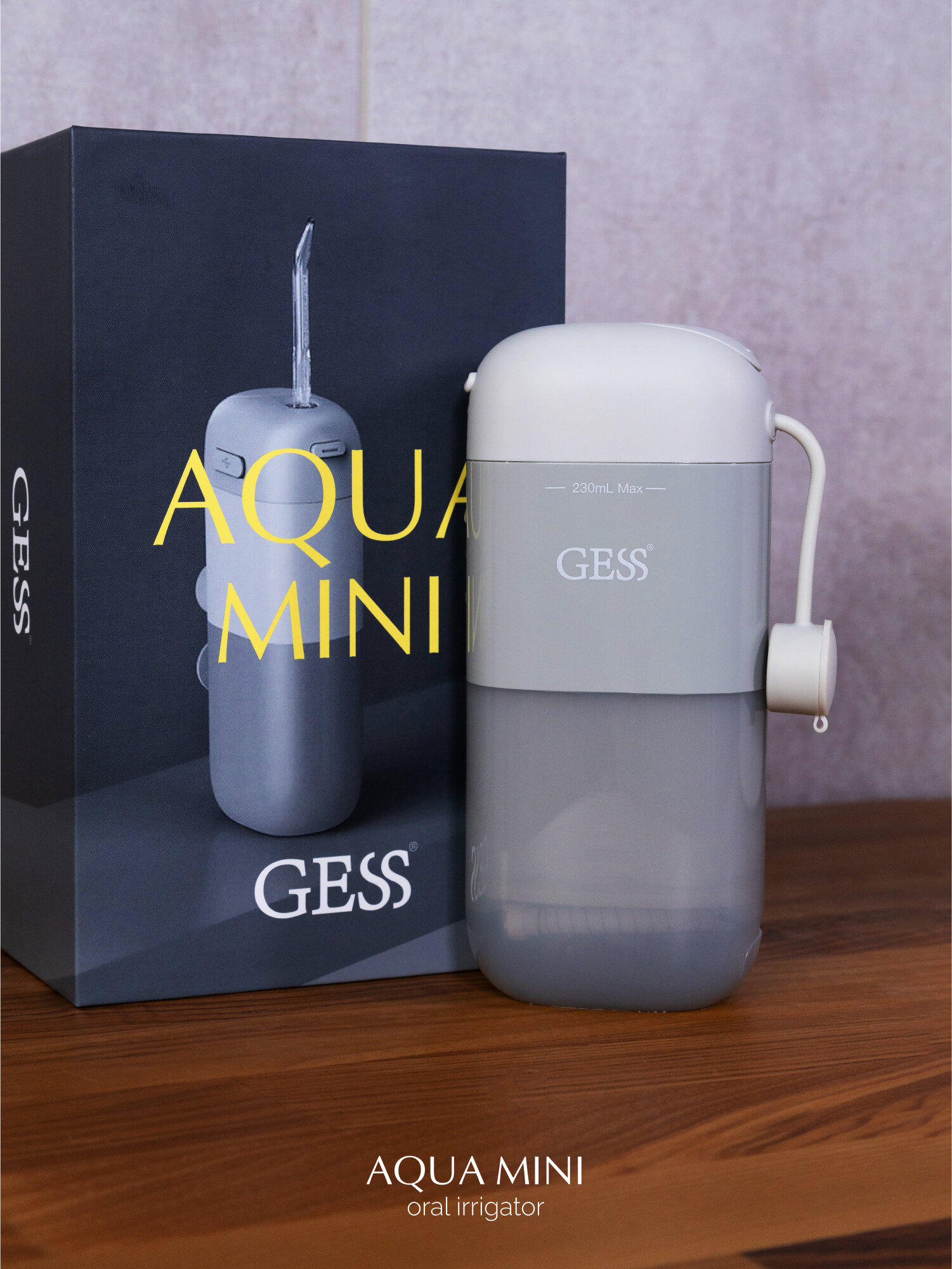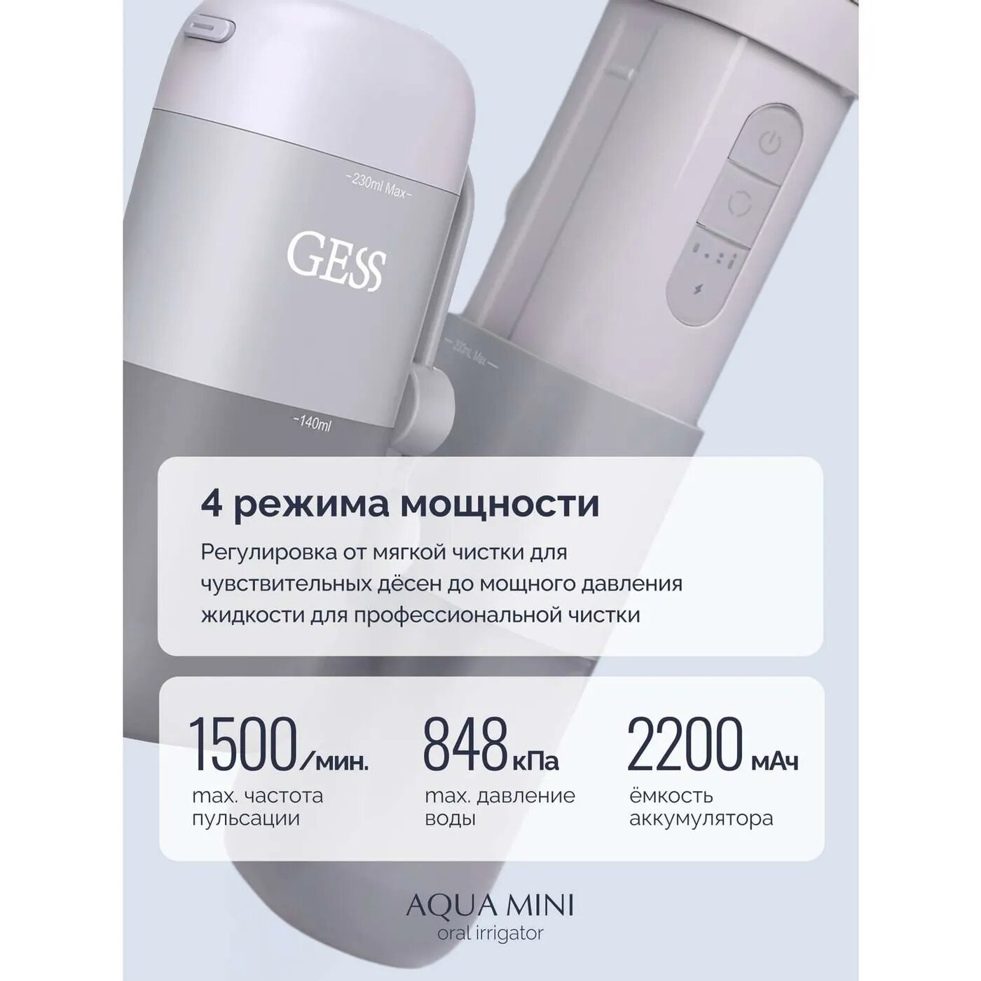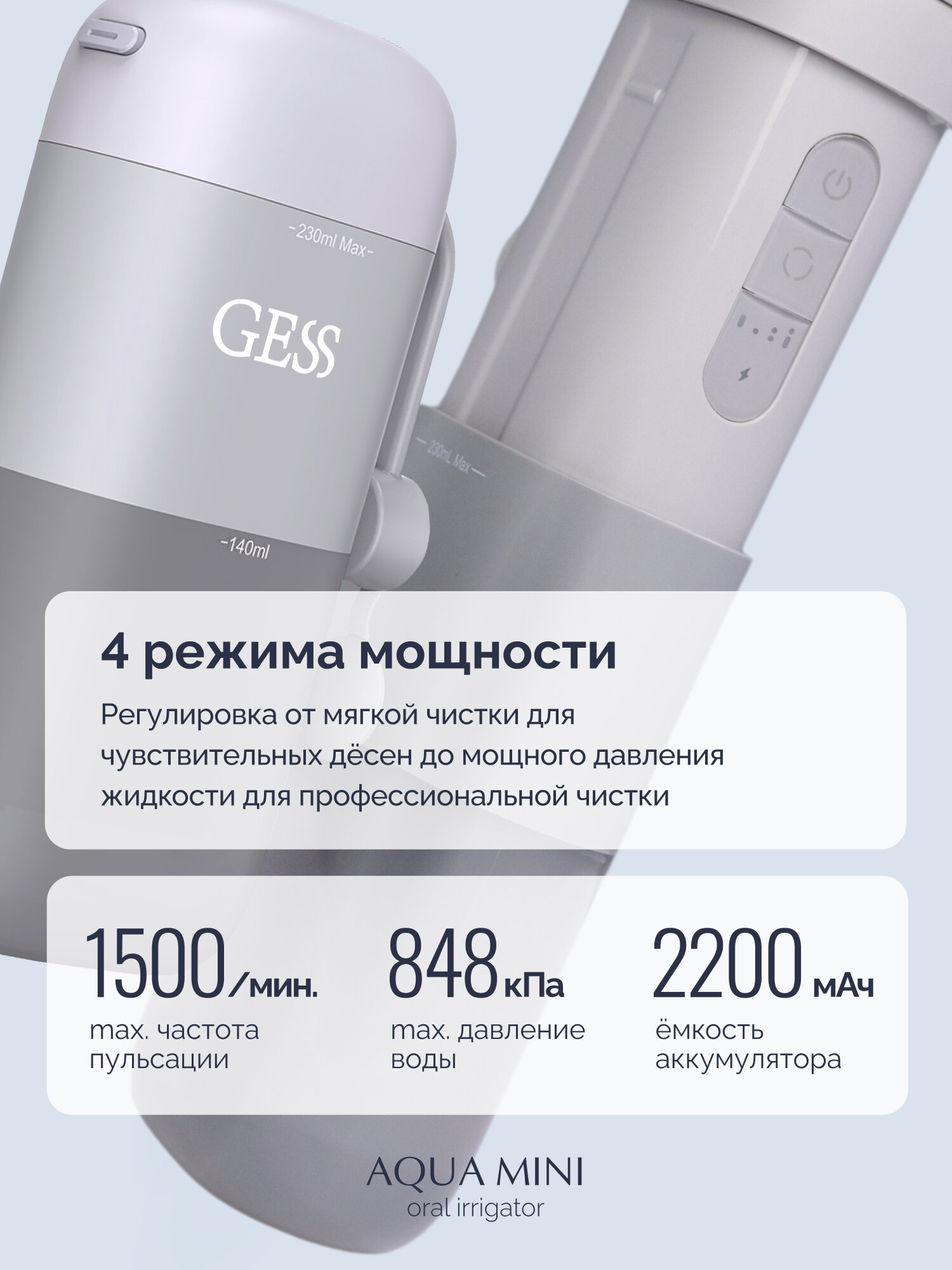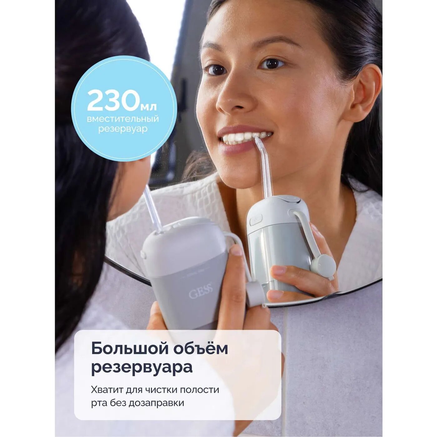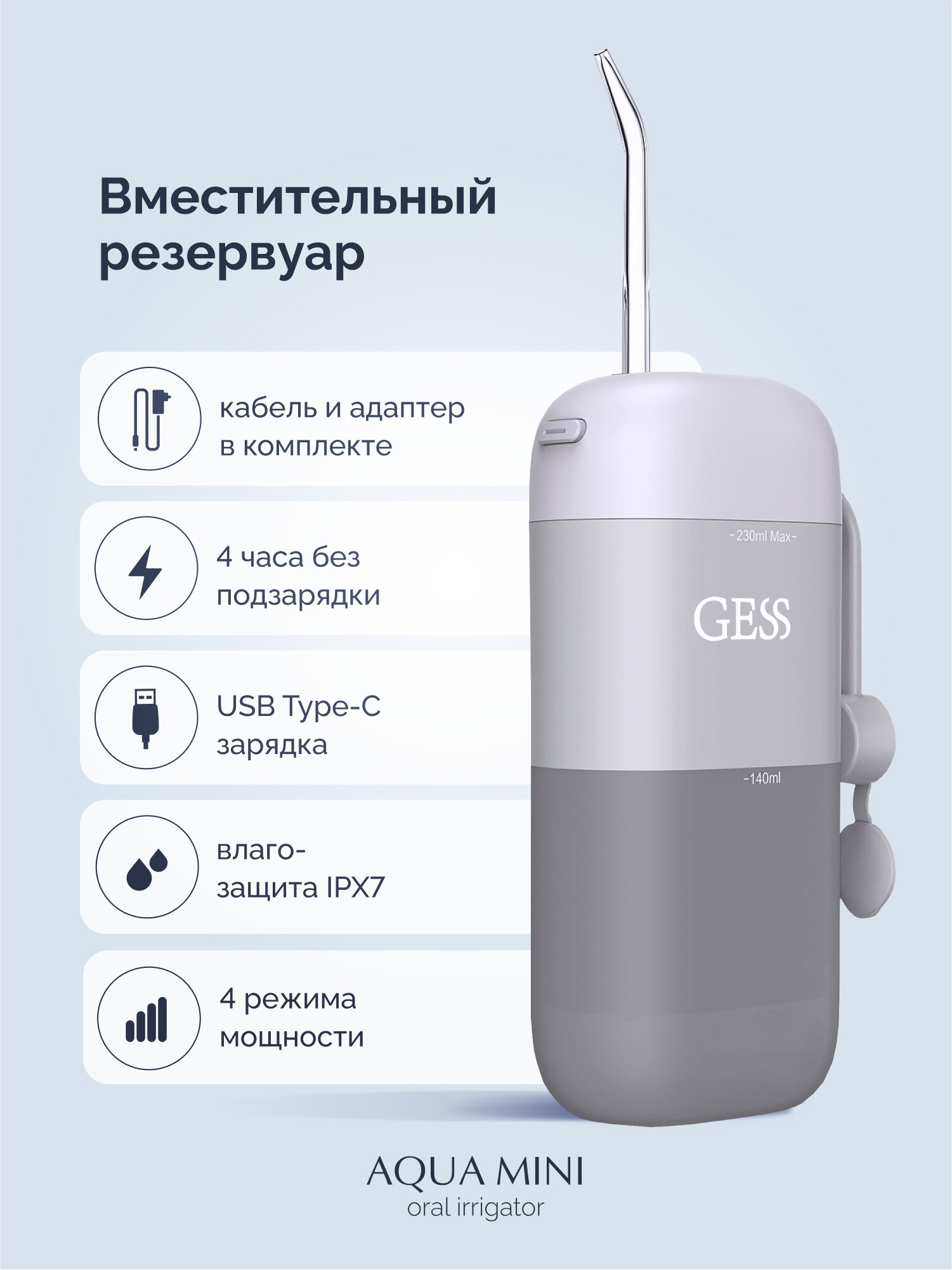 Ирригатор для полости рта портативный GESS Aqua Mini беспроводной медицинский ирригатор, 3 насадки, ёмкость 230 мл, 138-848 кПа, серый интересное: