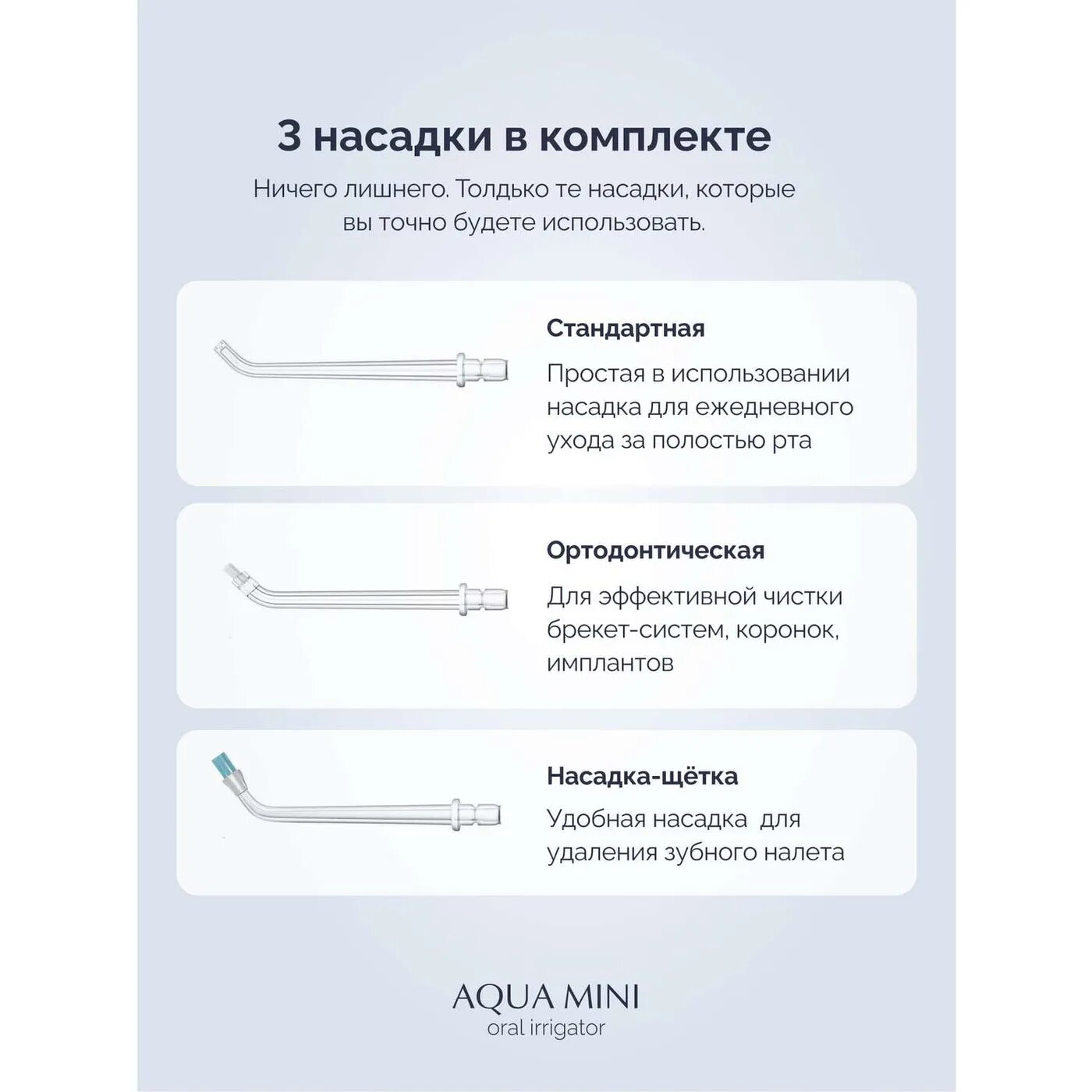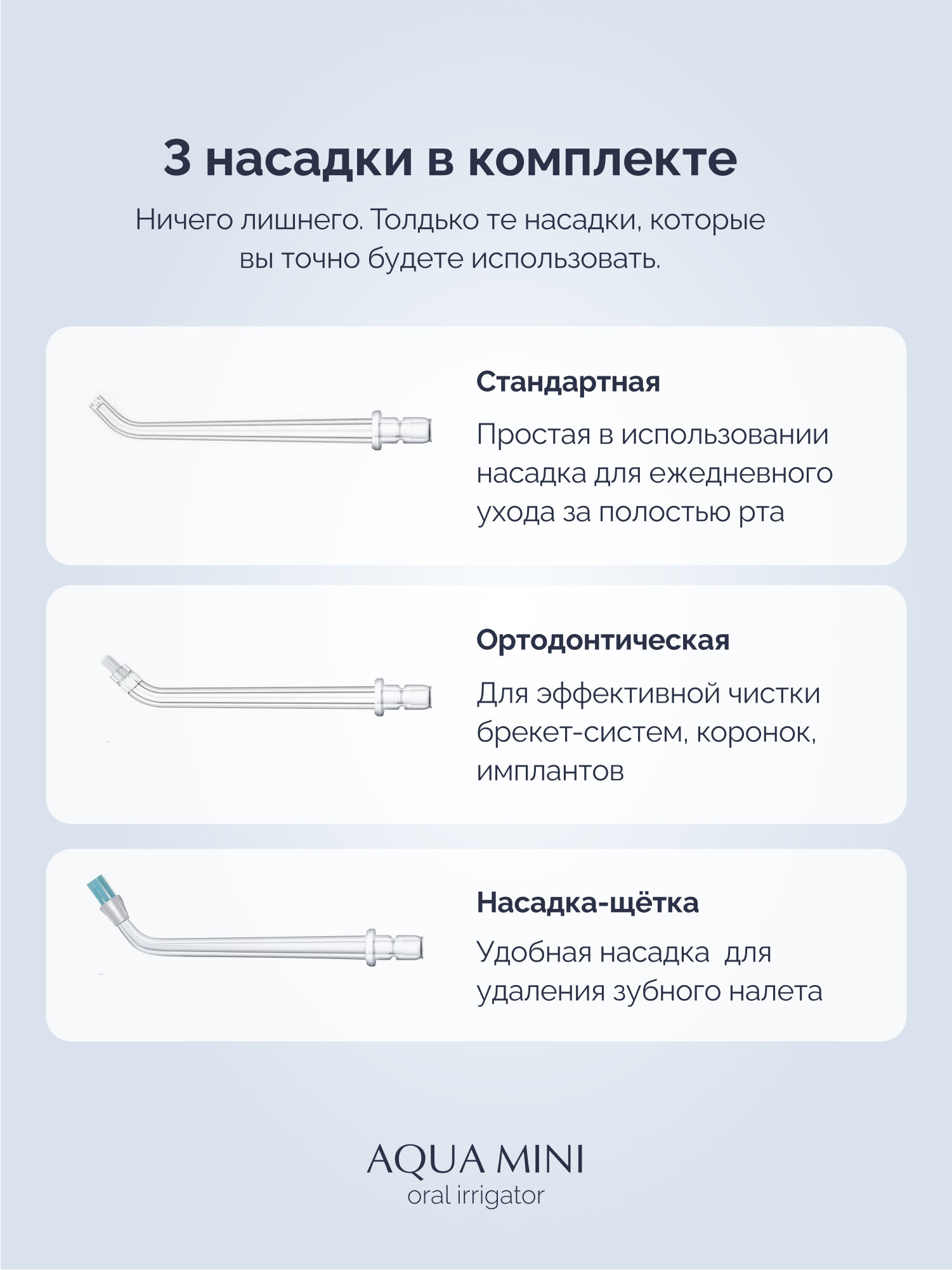 | Подробная комплектация | Ирригатор Aqua Mini. Насадки: Обычная 1 шт. Ортодонтическая 1 шт. Насадка для удаления налёта с поверхности зубов 1шт. Инструкция. Гарантийный талон. Подарочная коробка. Гофрокоробка.. |