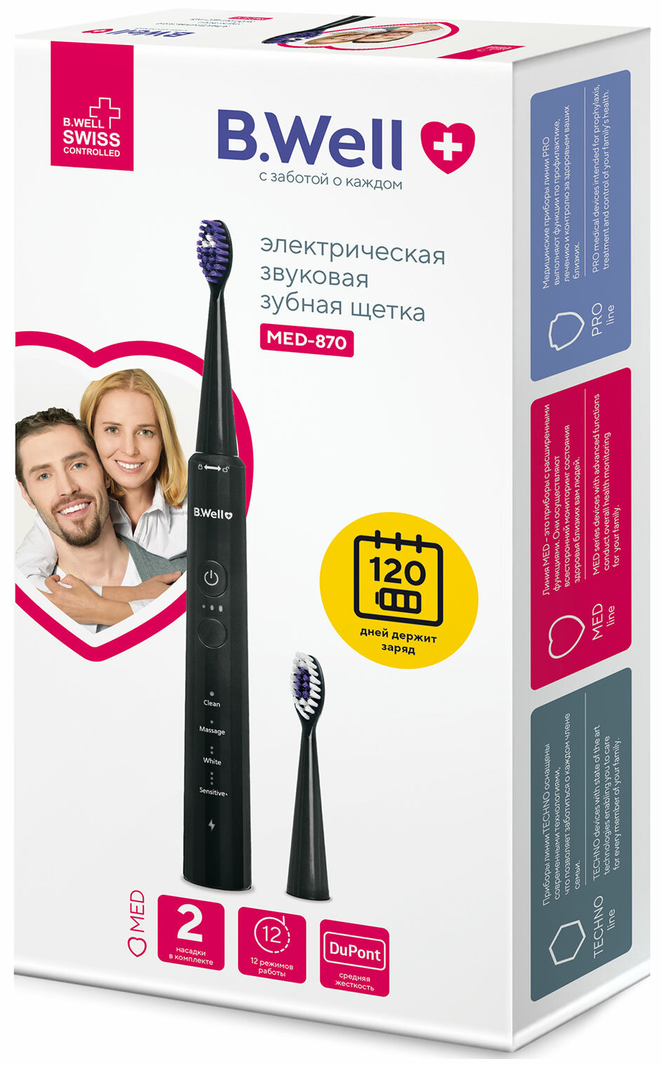 Электрическая зубная щетка B.Well MED-870 звуковая черная, 12 режимов, 120 дней без подзарядки