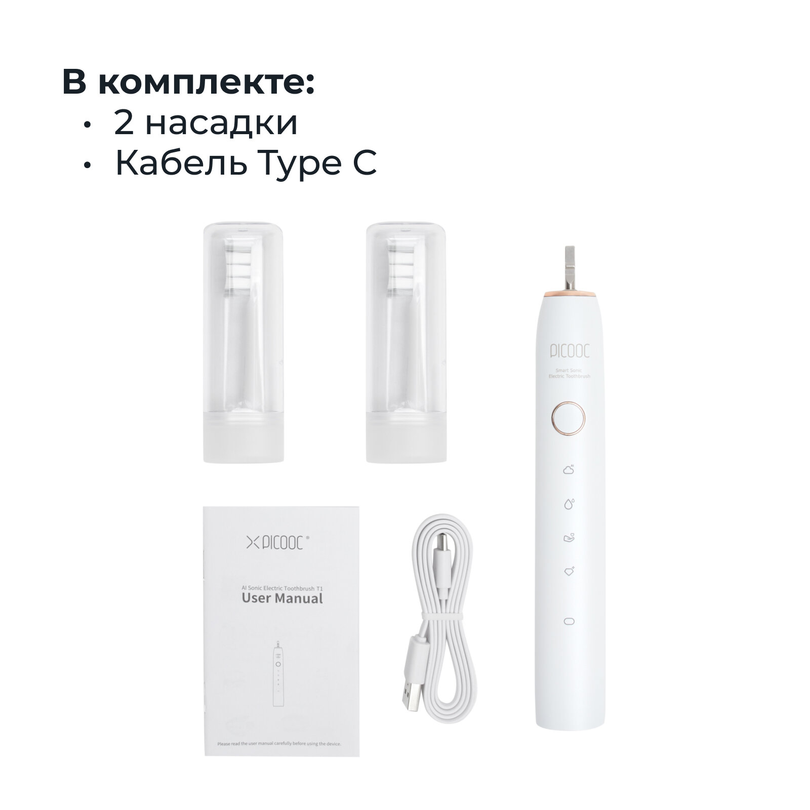 | Подробная комплектация | Зубная щетка, сменные насадки с волокнами DuPont (2 шт.), кабель для зарядки USB Type-C, документация |