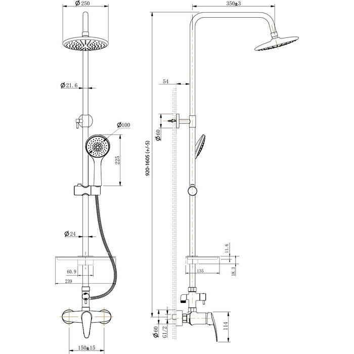 | Комплектация | верхний душ / держатель лейки / лейка / мыльница / полочка / шланг |