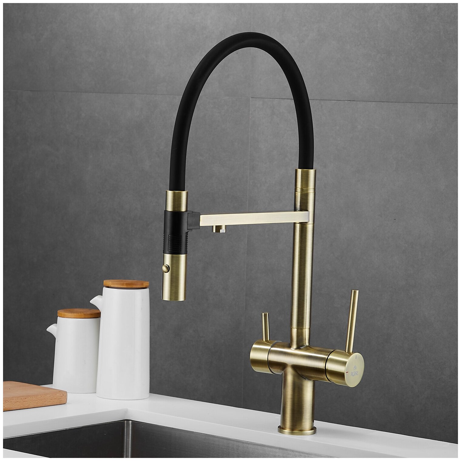 Смеситель для кухни с гибким изливом и подключением к фильтру Rose R958G, золотой сатин
