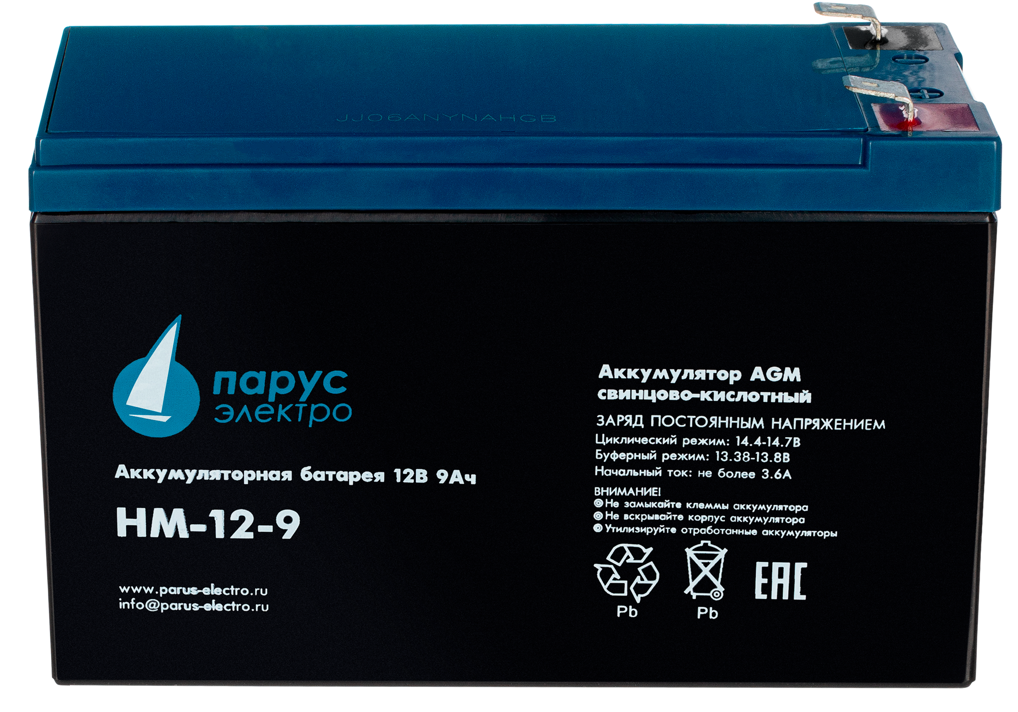 Парус электро HM-12-9, Батарея Парус Электро, стандартная серия HM-12-9, напряжение 12В, емкость 9Ач (разряд 20 часов), макс. ток разряда (5