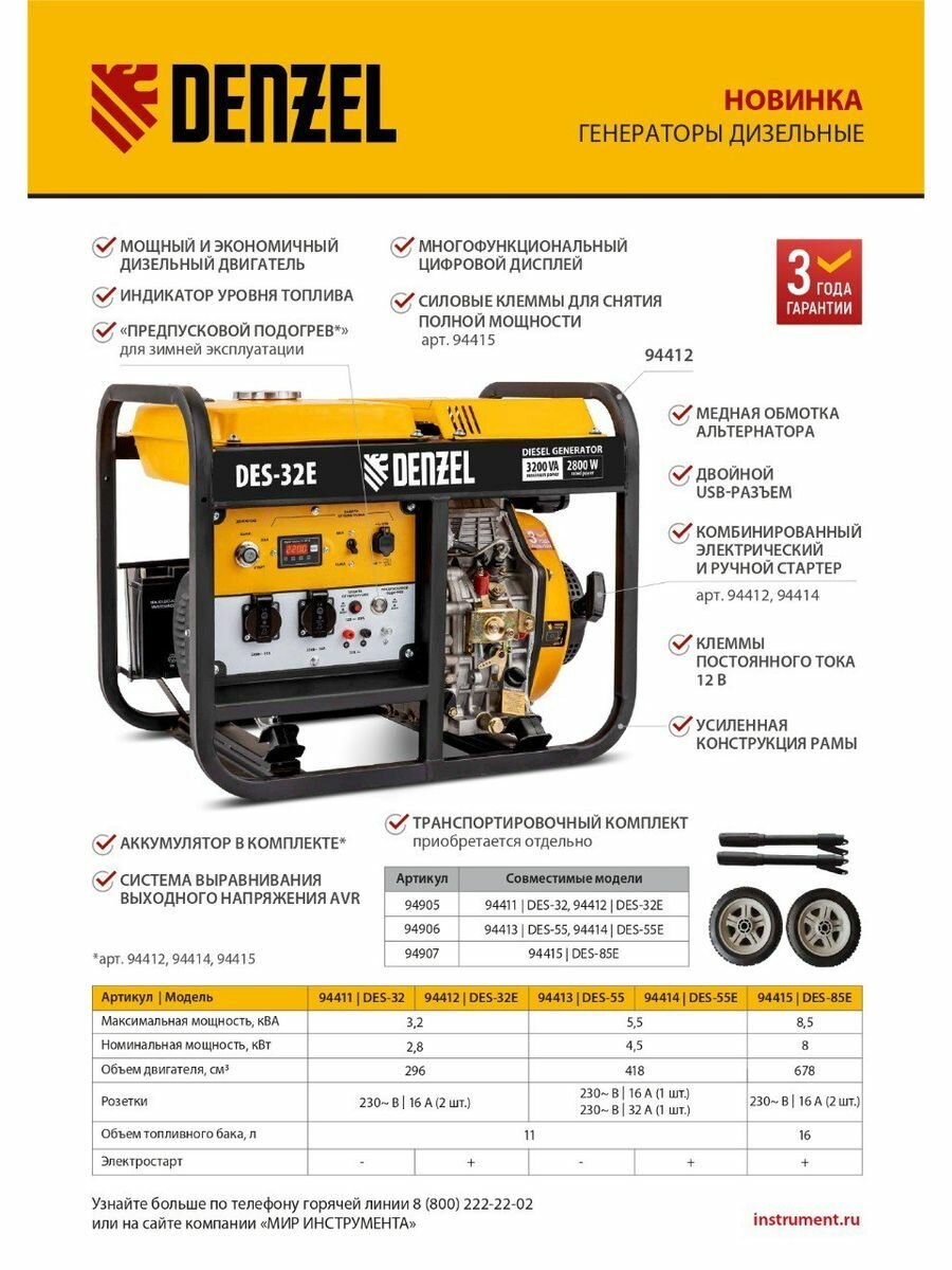 Ниже Вы можете прочитать отзывы на Генератор дизельный Denzel DES-32E, 3,2 кВт, 230 В, 11 л, электростартер 94412, ознакомится с подробными характеристиками, посмотреть интересные обзоры и фотографии на Генератор дизельный Denzel DES-32E, 3,2 кВт, 230 В, 11 л, электростартер 94412.