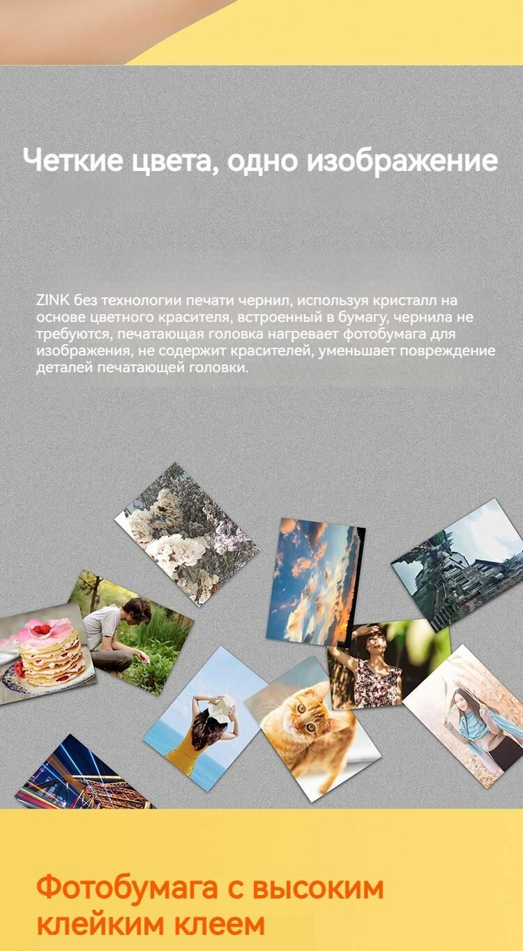 | Комплектация | Список упаковки Принтер×1, Инструкция по эксплуатации×1, 50шт фотобумаги , USB кабель для зарядки×1" |